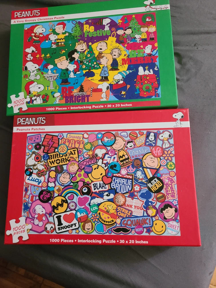 Two Peanuts themed jigsaw puzzles. One features a festive Christmas theme, while the other features a collage of patches and characters. Doing puzzles can be a wonderful way to unwind and relax at the end of a long day.