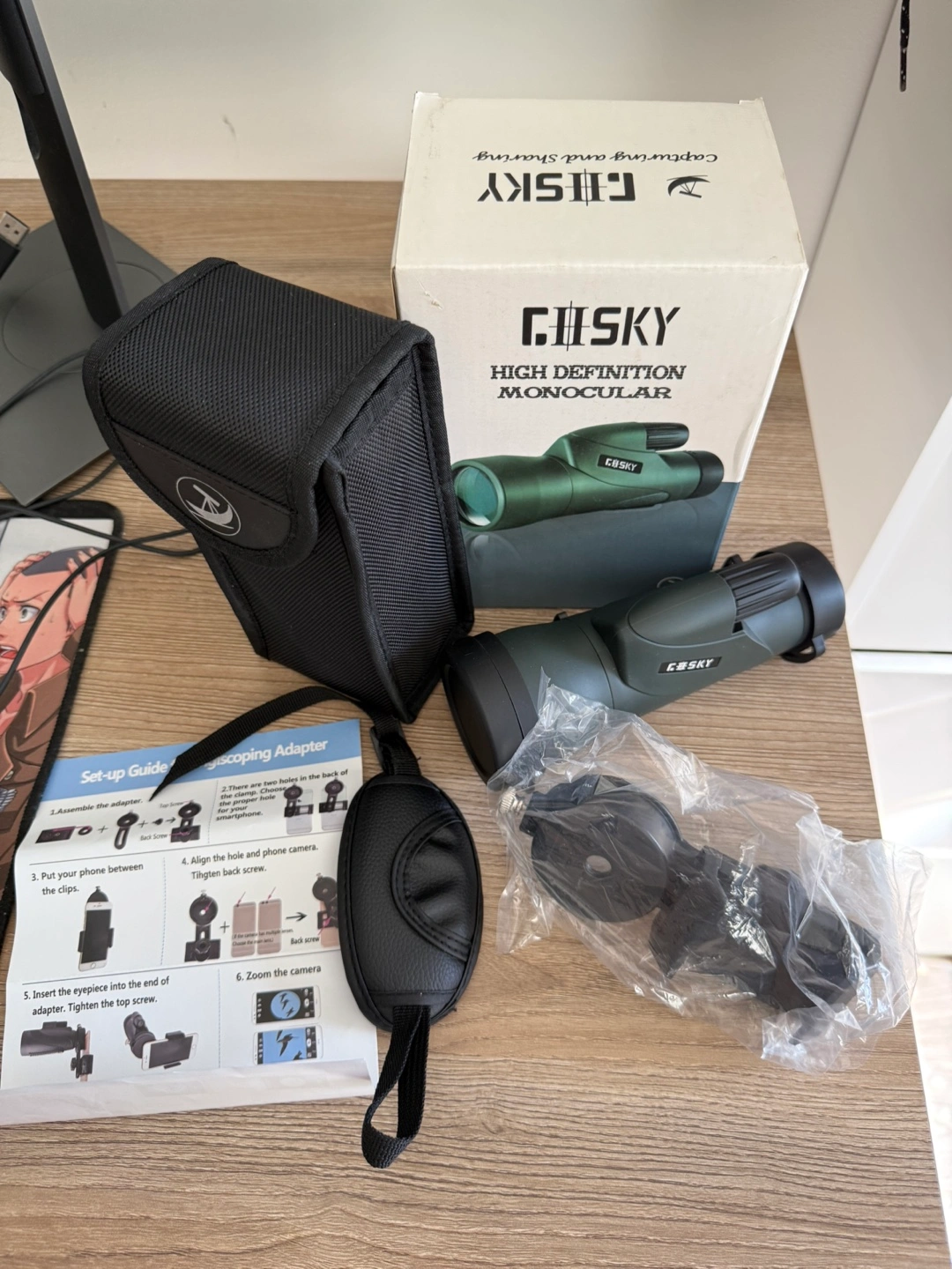 Selling a monocular with accessories.