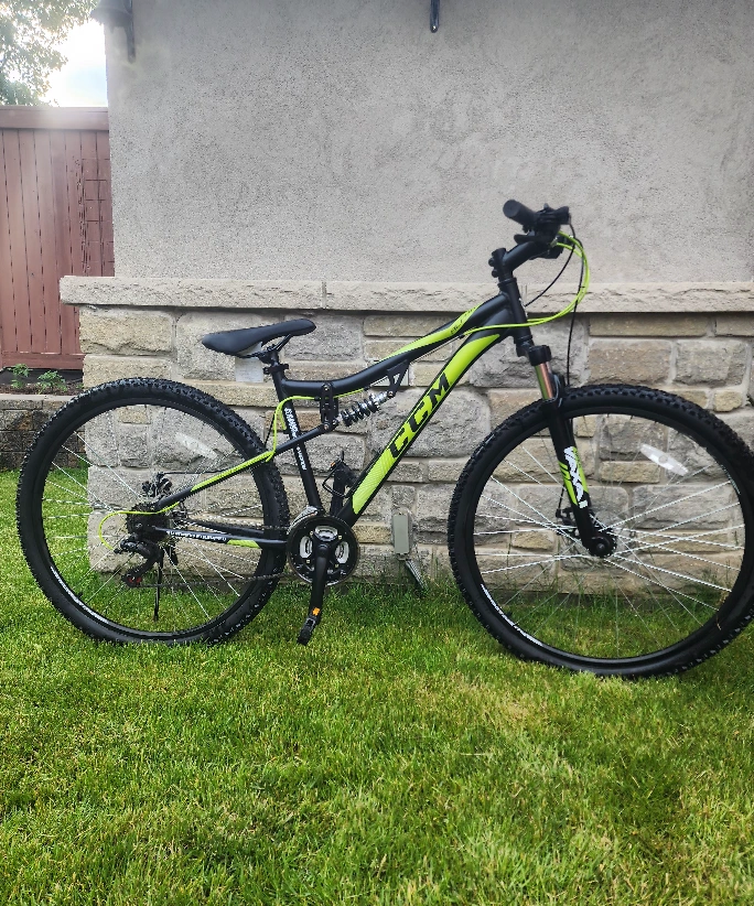 This CCM Alpha "29" mountain bike features a black frame with neon green accents. It has dual suspension with large wheels that provide stability and great rollover performance. This bike is perfect when hitting the trails.