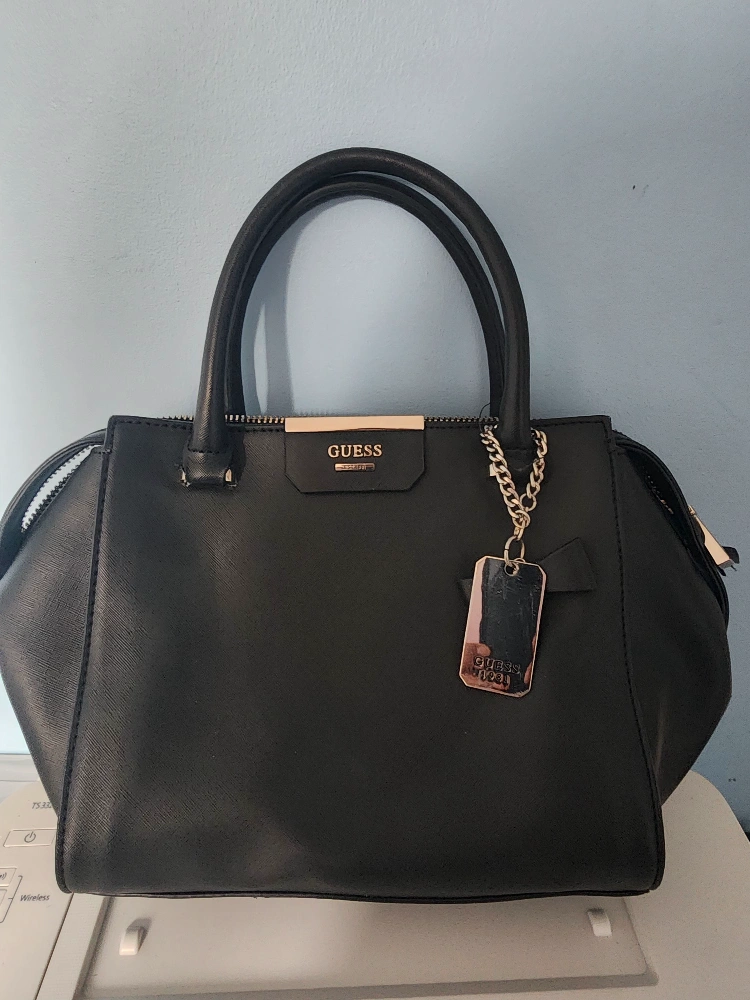 86I am selling a lovely black handbag. Features a chain with a tag, and two handles. You can use this bag to hold all your everyday necessities.