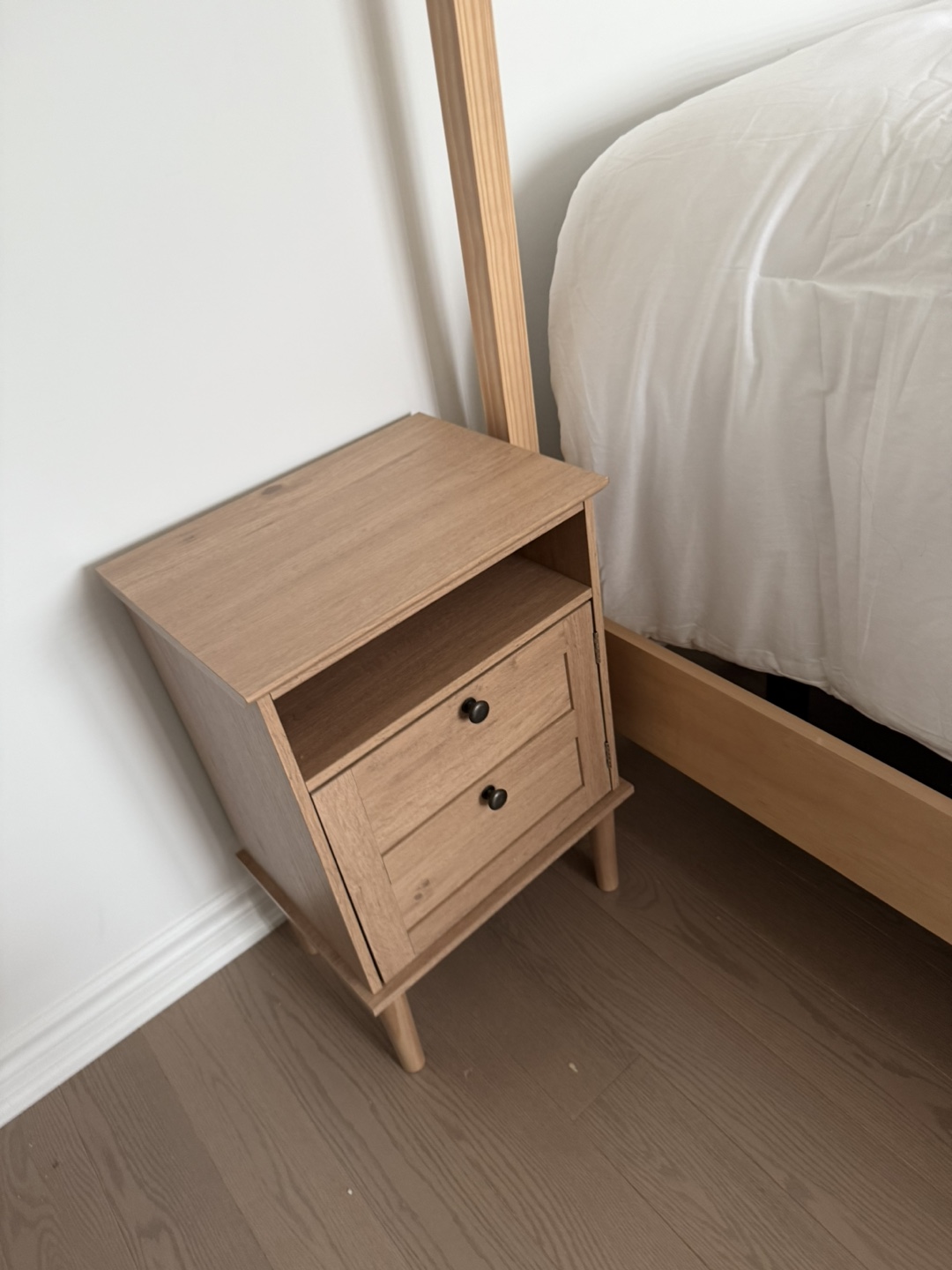 NEW wooden nightstand with two drawers and a top shelf space. This nightstand is a cozy place to place your books before bed.