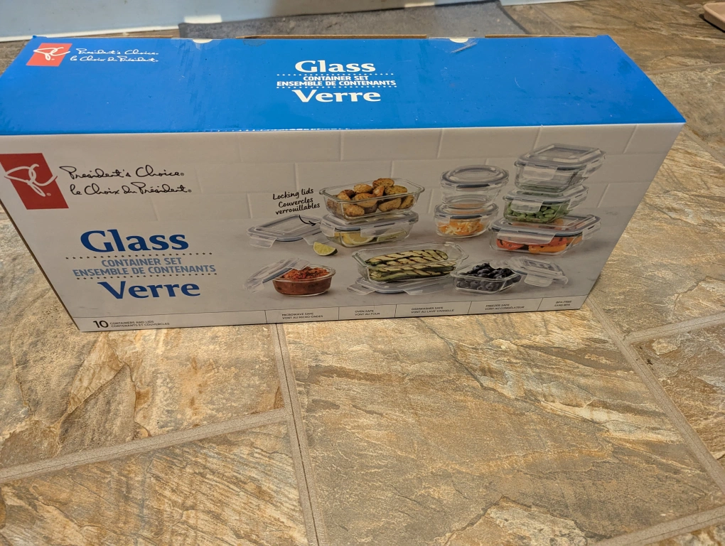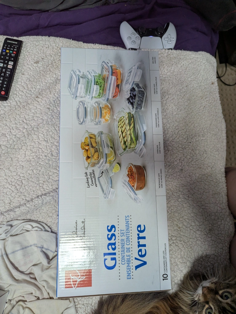 Still I'm box. A new set of glass food containers. The set includes locking lids and can be used in the microwave or freezer. These are perfect for storing your meals for the week, making your life a little easier.