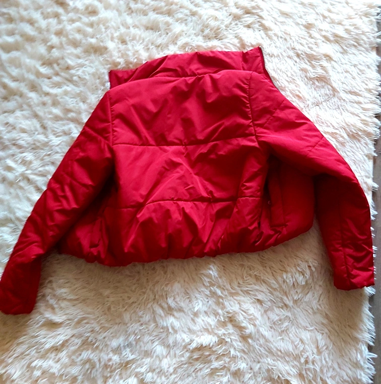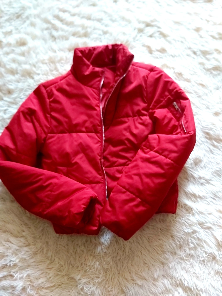 A beautiful puffer jacket. Features a collar, zip closure, and front pockets. The colour is a vibrant red. You can find comfort by wearing this jacket when the weather is cooler. perfect for spring or fall.