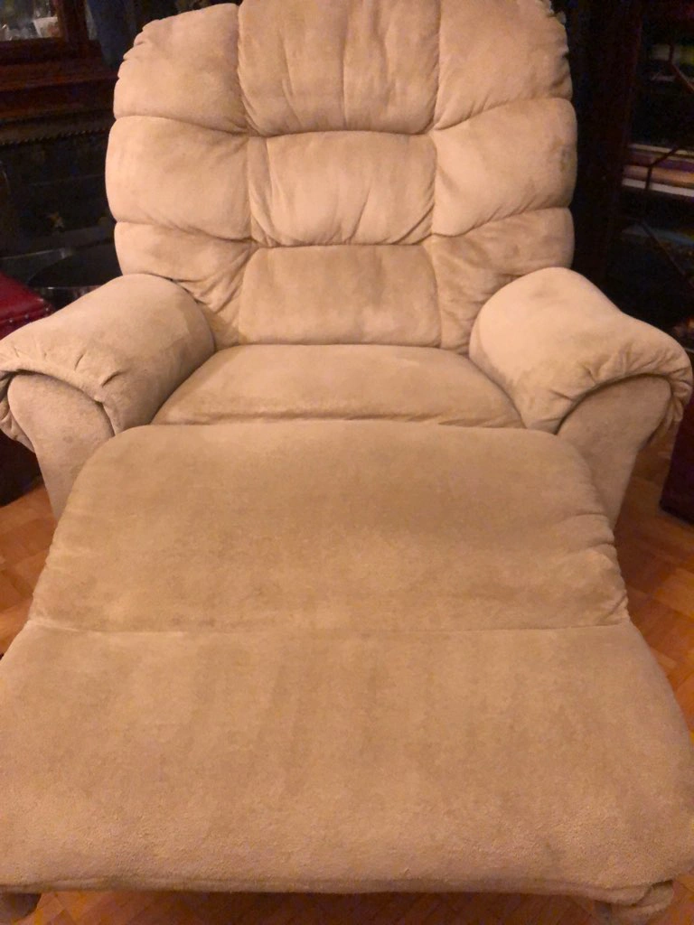 Beige colored chair. It reclines. Soft material. Provides a comfortable seating experience, perfect to unwind at the end of the day.