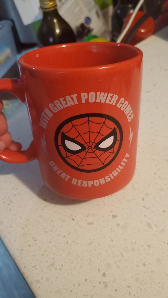 Red mug with Spider-Man images. Images include Spider-Man himself and a spiderweb design. The other side of the mug has an image of Spider-Man's mask and the quote, “With great power comes great responsibility”.