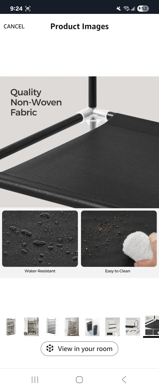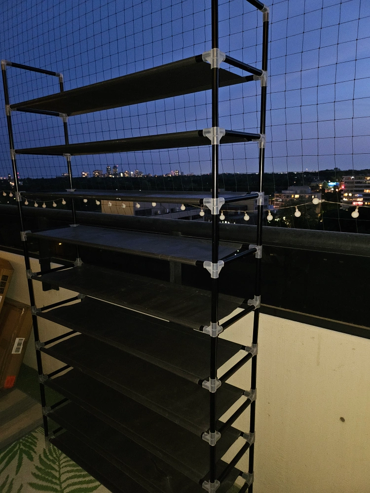 The shoe rack is wiped clean and is currently assembled. It is lightweight enough that it can be carried out easily.