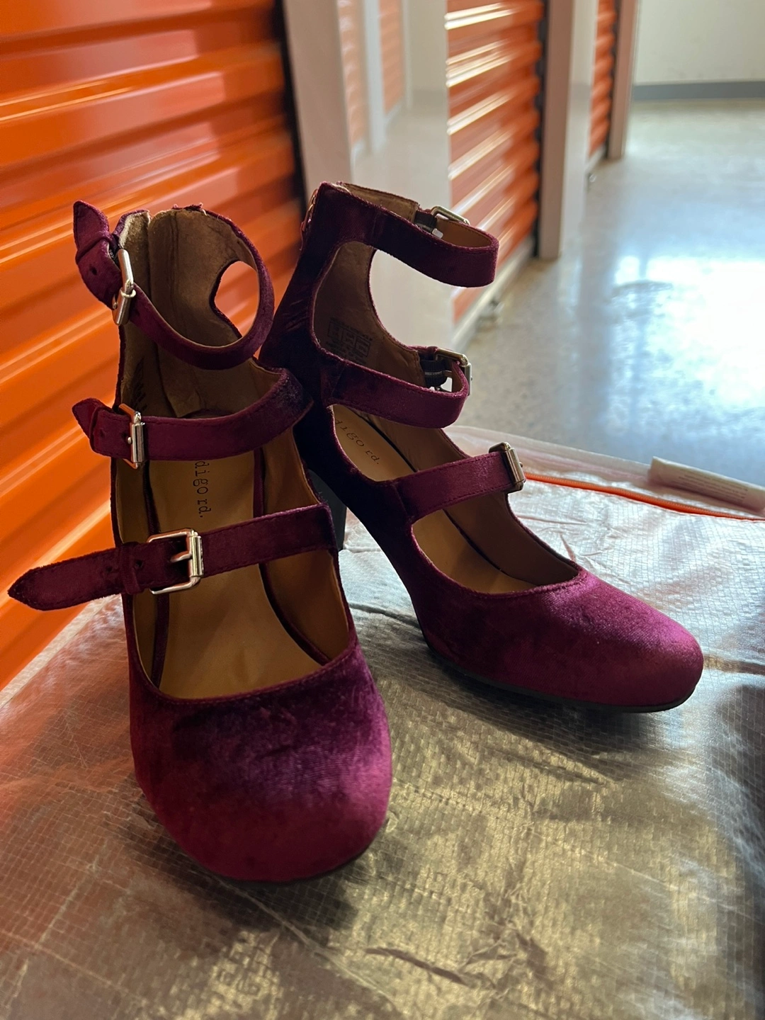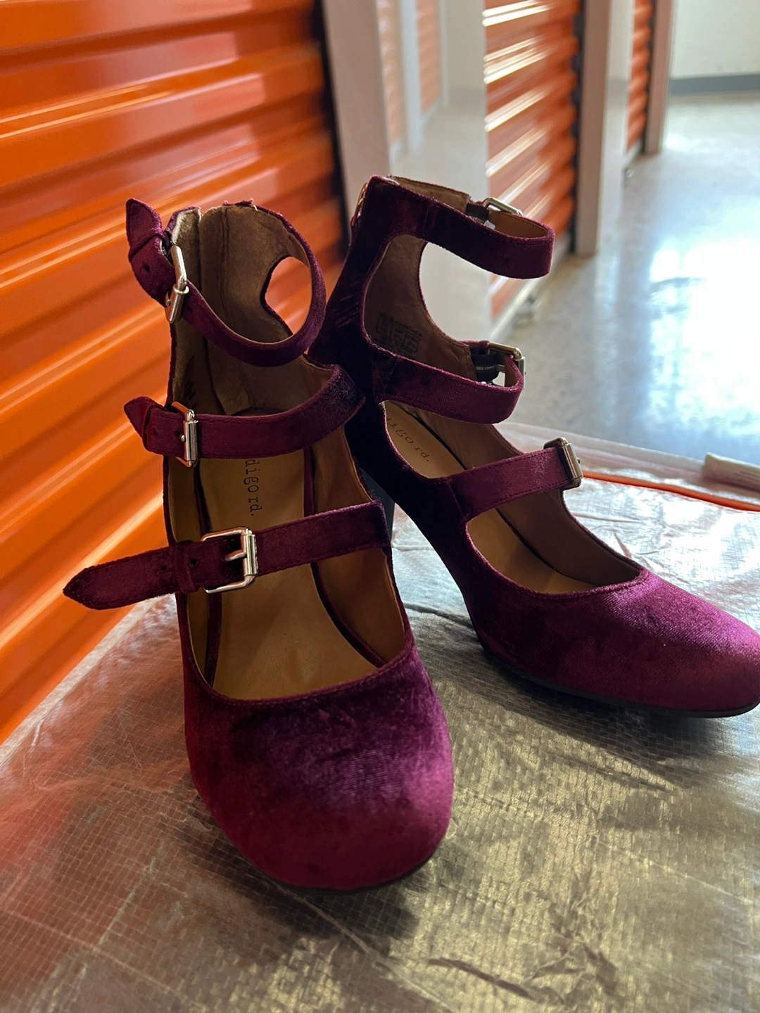 Beautiful heels with a rich, velvety texture. Ankle straps with multiple buckles. Perfect to wear on a night out with friends.