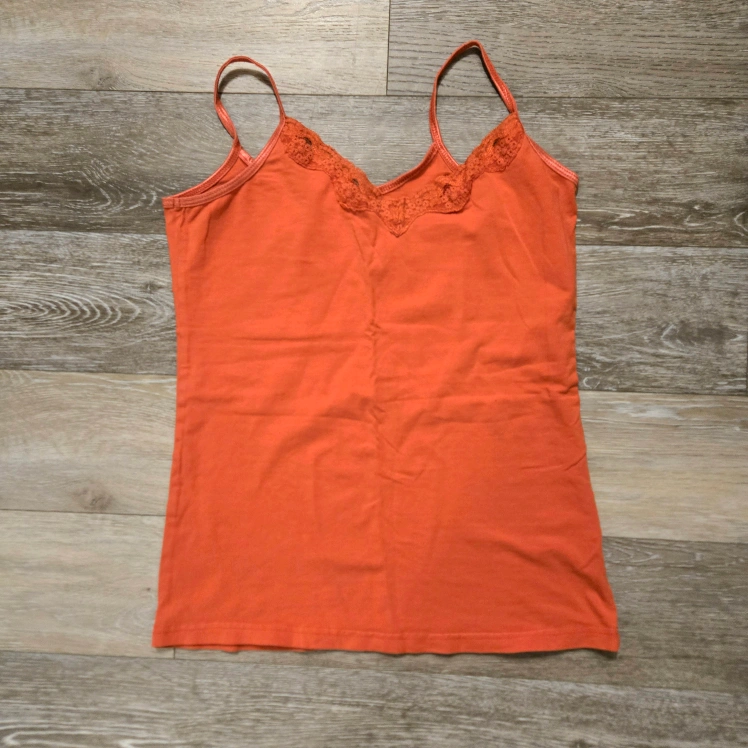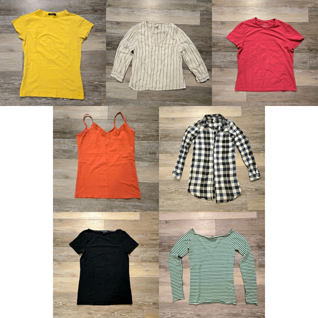 Collection of various shirts, including short-sleeve and long-sleeve styles. One orange camisole with lace trim. A striped long-sleeve and green striped top, perfect for layering. The shirts are easy to incorporate into any outfit. I hope you enjoy them.