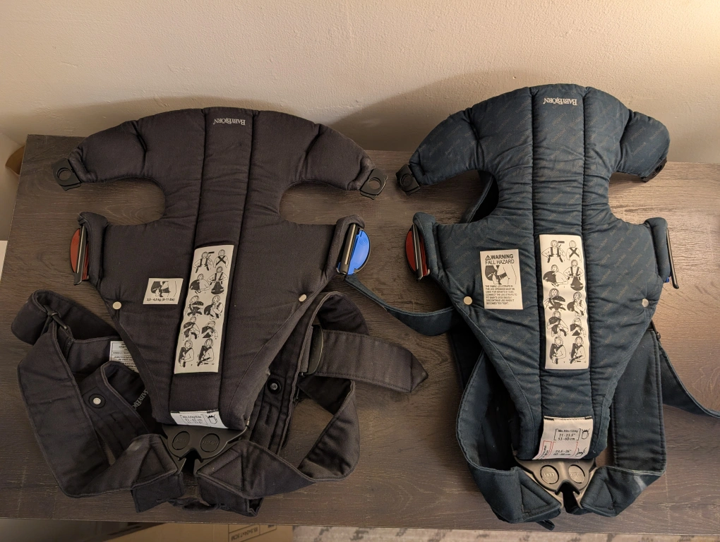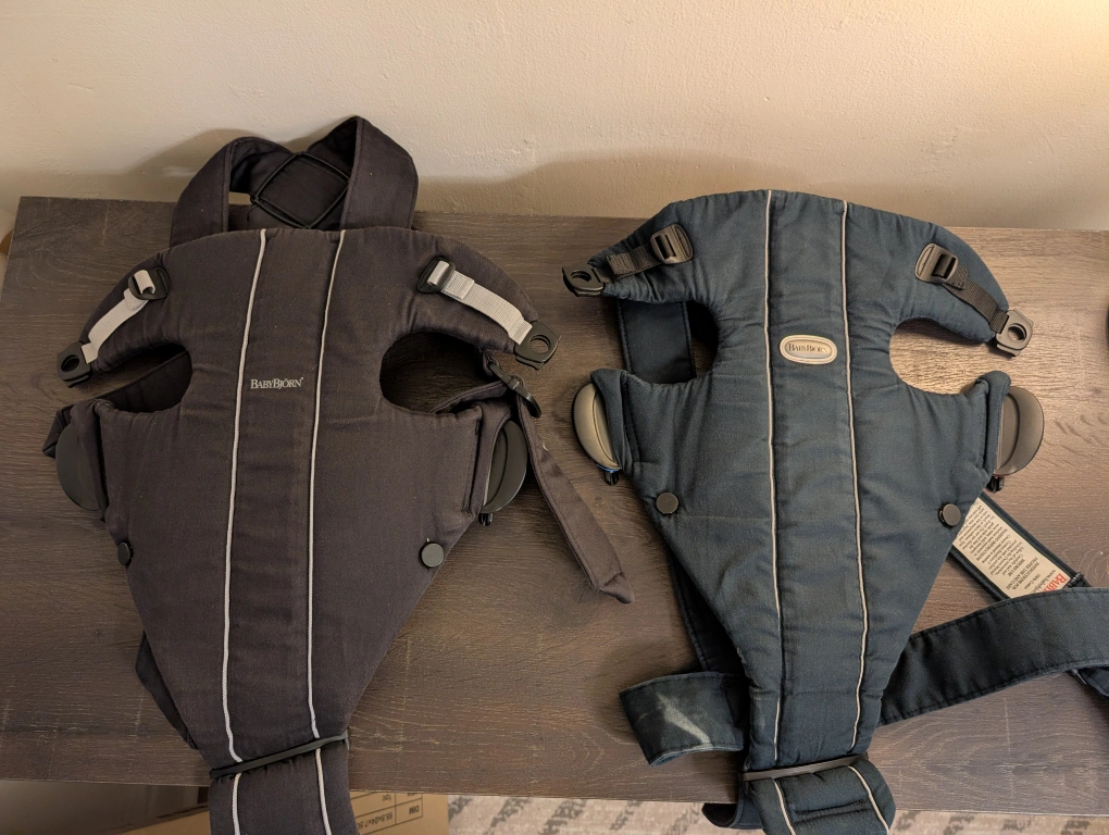 Includes two BabyBjörn Original carriers: one black, one dark green/blue
