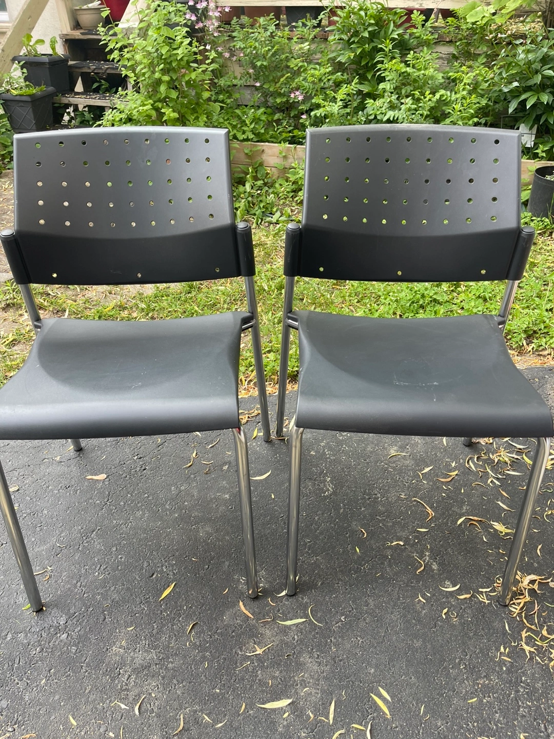 294Chairs with black seats and backs. They also have silver legs. A perfect item for reading a book and enjoying the peace and quiet. Very Strong comfortable both the same chairs. $15 each