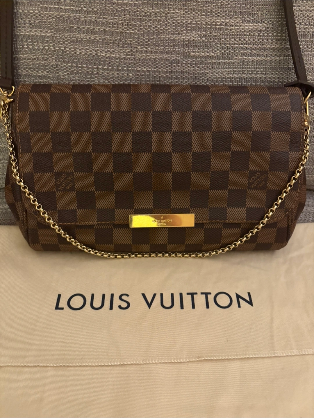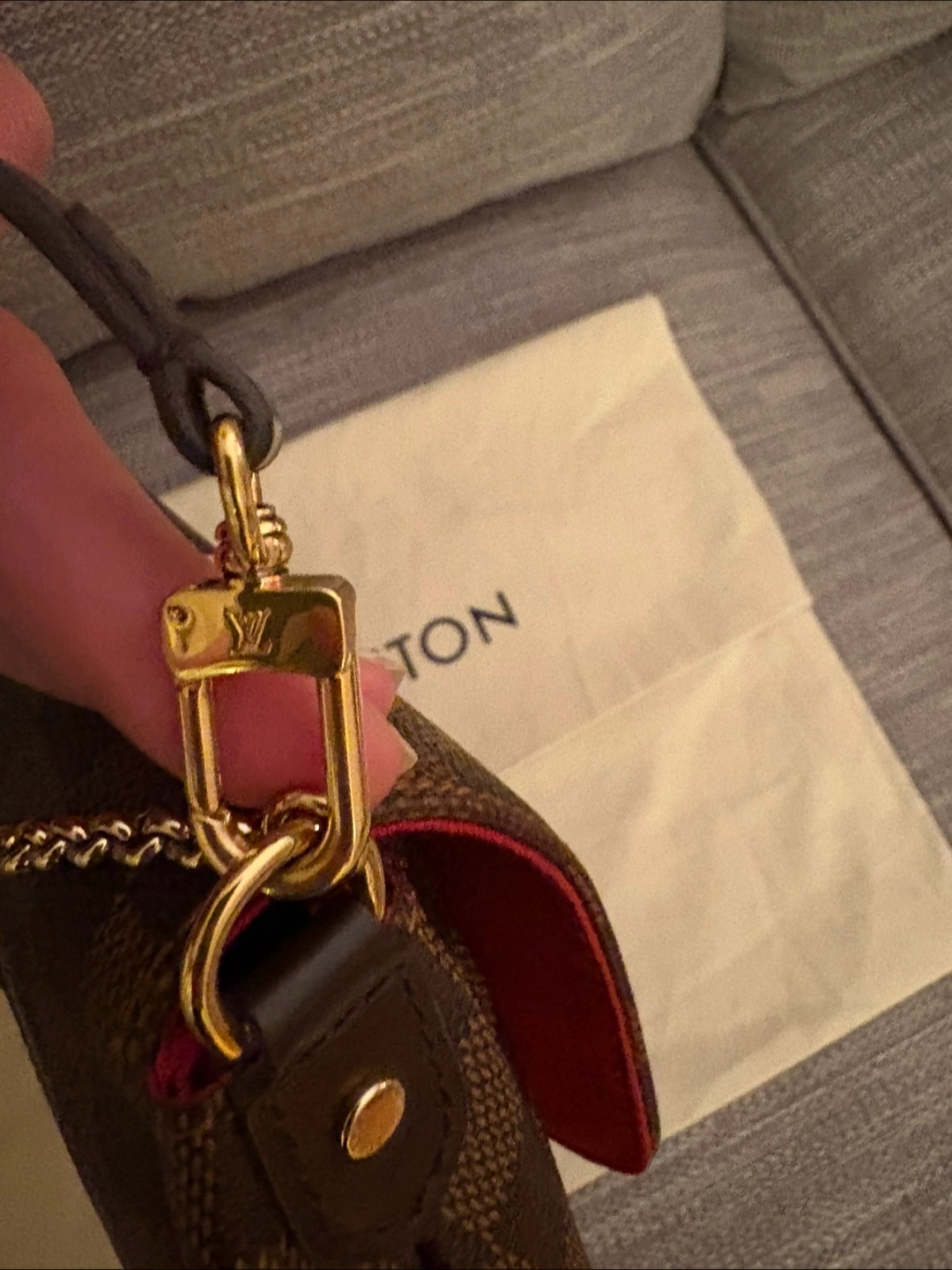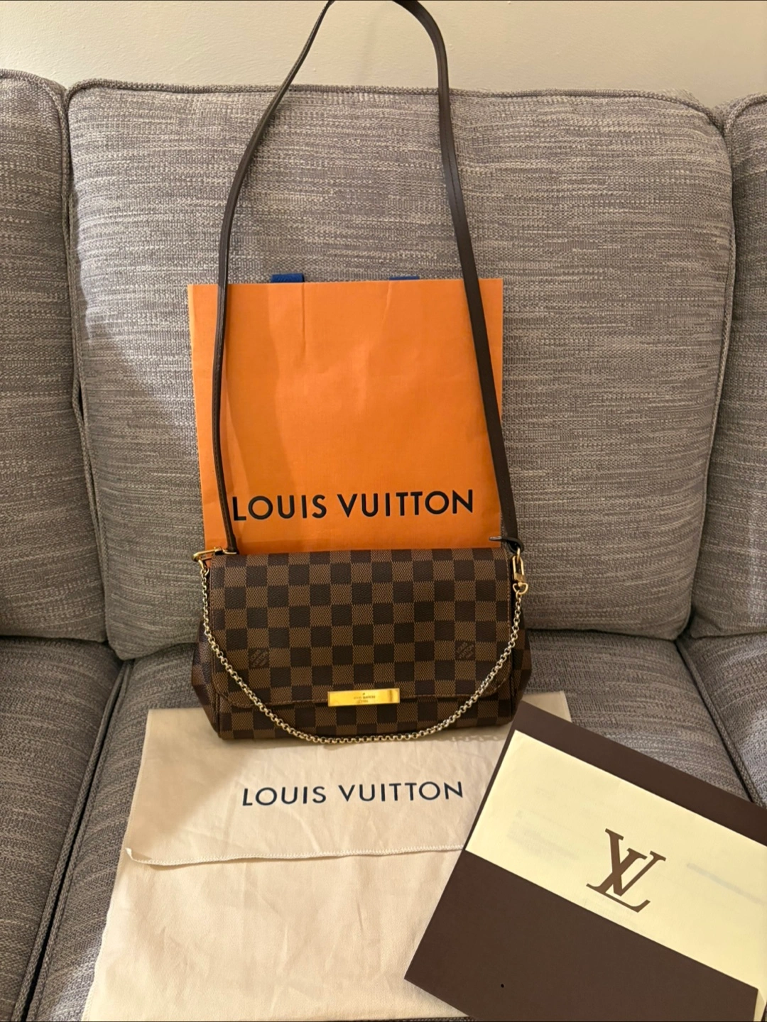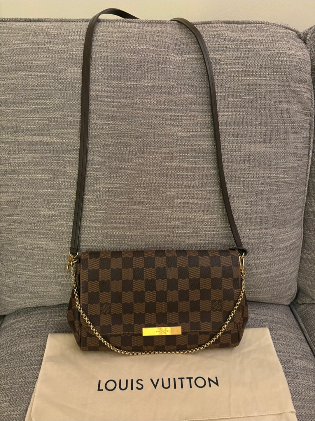 A charming crossbody bag. Featuring the signature damier ebene canvas. Includes a flap closure. Interior is lined with a red fabric. Also, it comes with a chain strap, you can wear it as a shoulder. A great item to store all of your essentials. Made in France Date Code: FL4185 Excellent condition Comes with dust bag and receipt