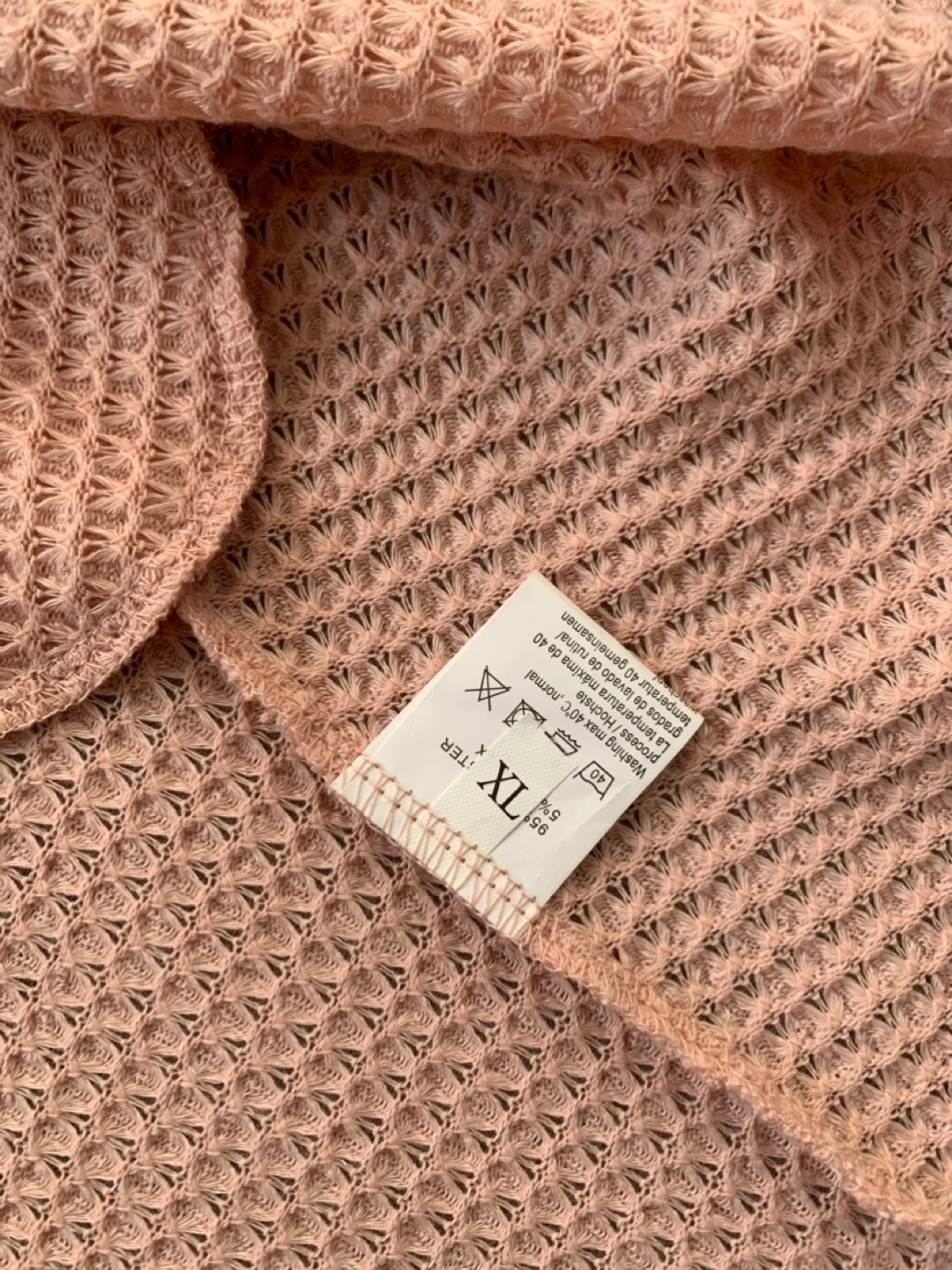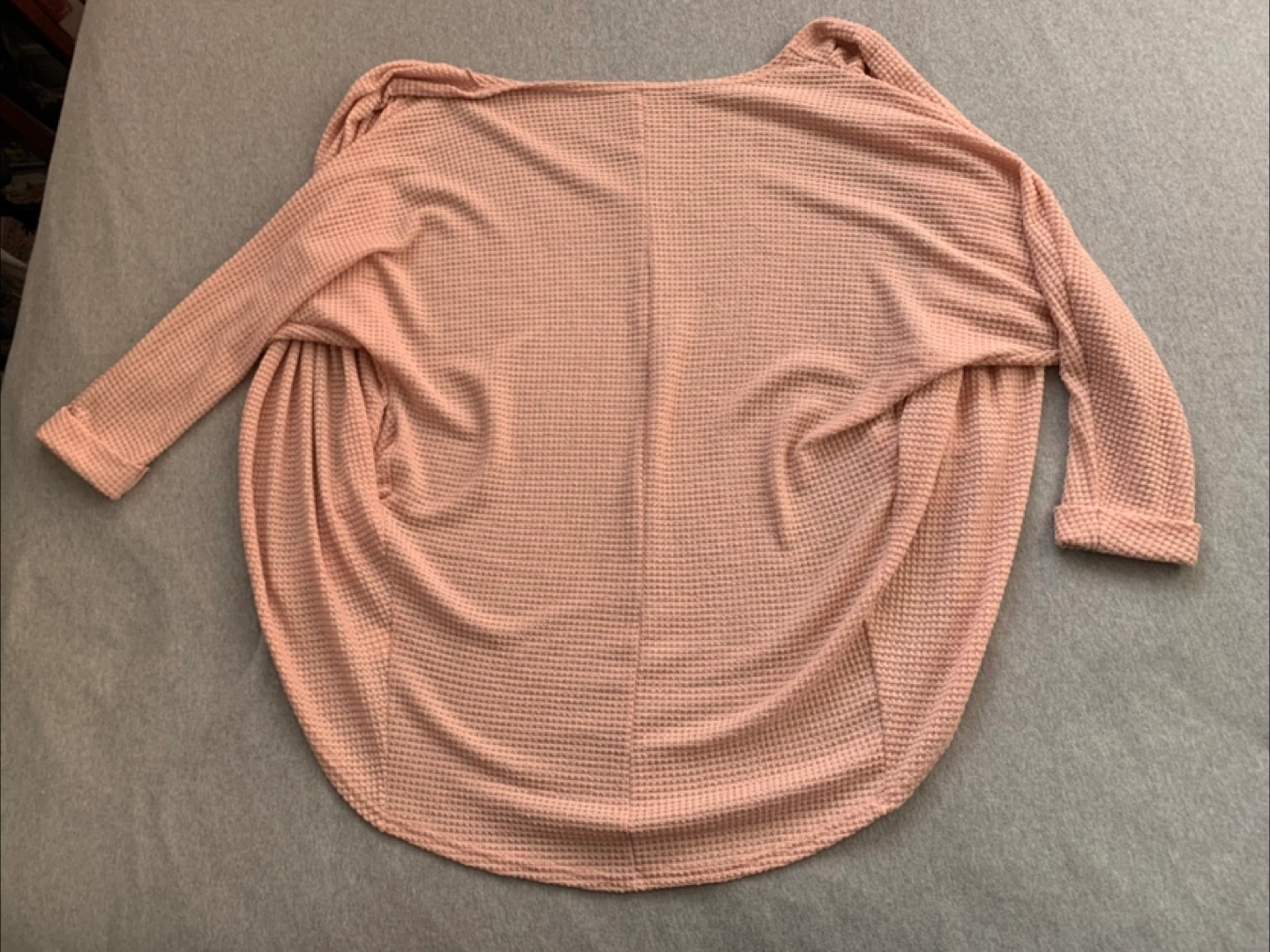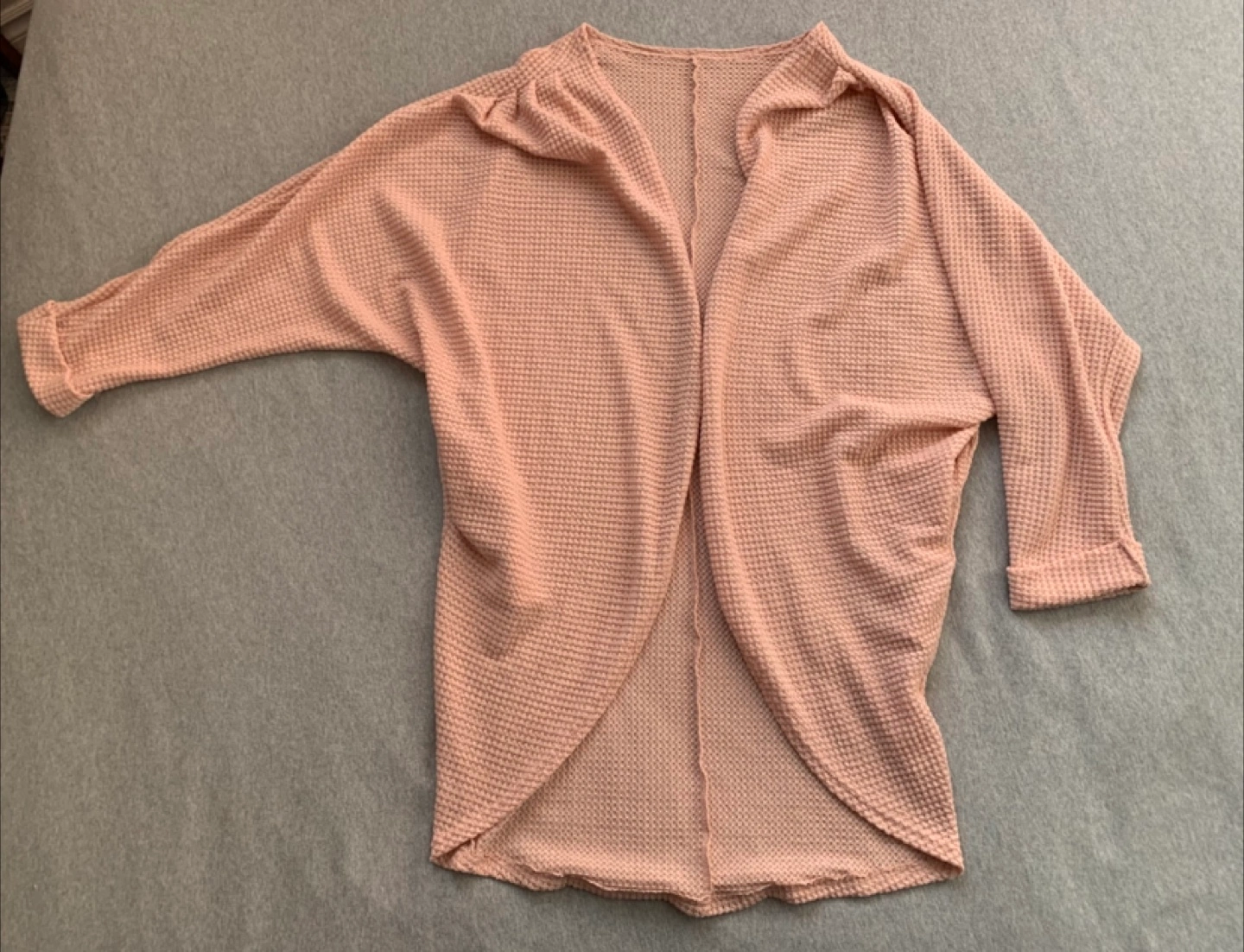 A light pink cardigan. Features a waffle knit pattern. With long sleeves. Size XL. Pleasant scoop back detail fit.
