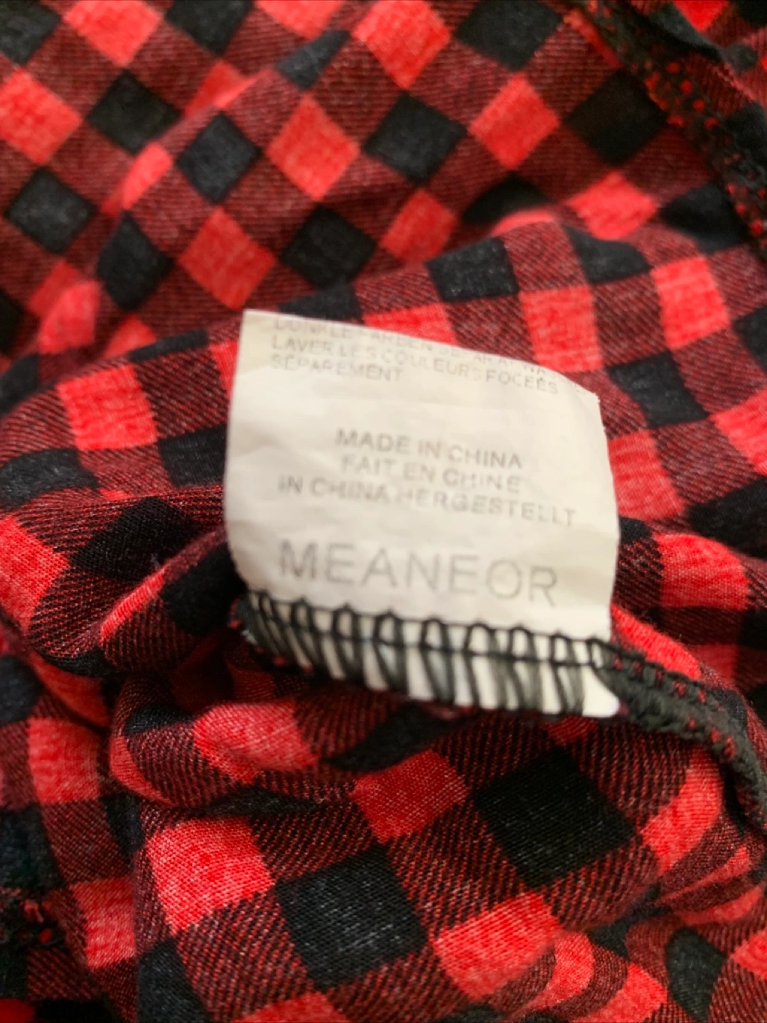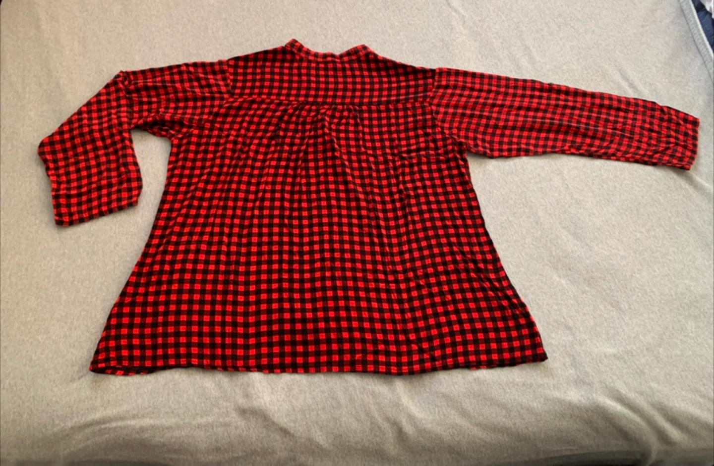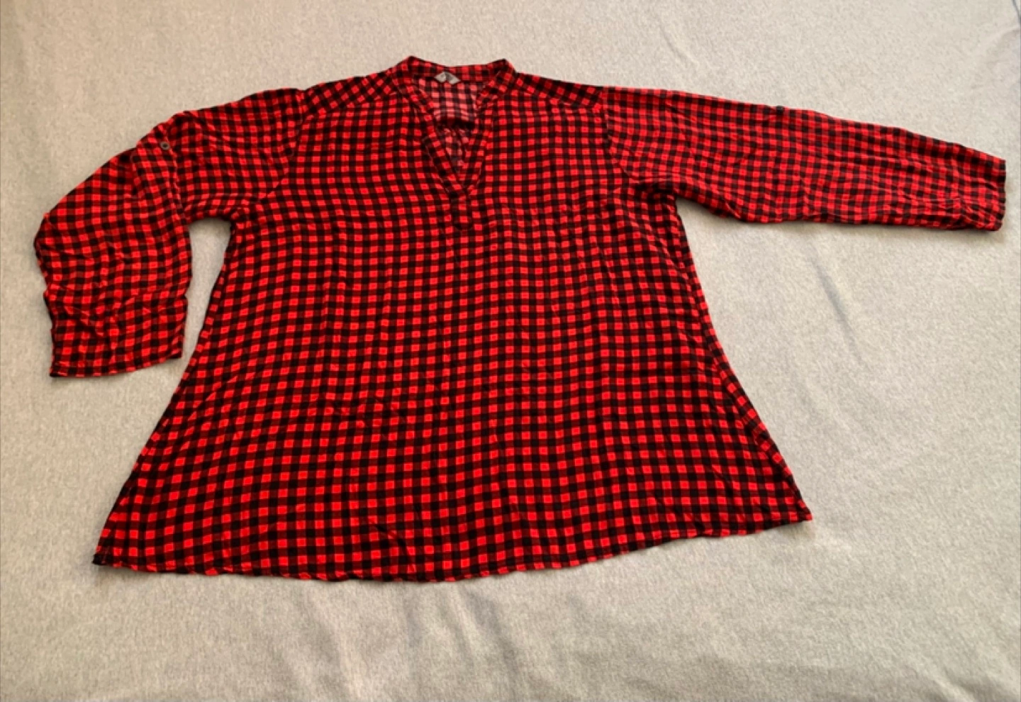 A flowing top in red and black checkered pattern. It has long sleeves, a v-neck opening, and a relaxed fit. Sizing is not labelled. Would assume Large/XL Really nice soft feel. V-neck mandarin collar.