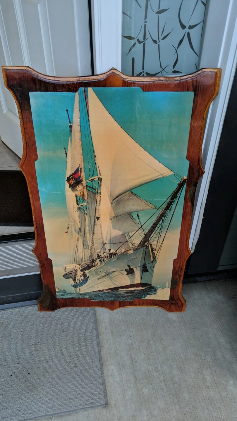A lovely, vintage print of a sailing ship. Frame has a detailed, dark wood finish. The image features a ship with sails and billowing flags against a blue sky. This would be a wonderful addition to any nautical-themed room to create a relaxing atmosphere.
