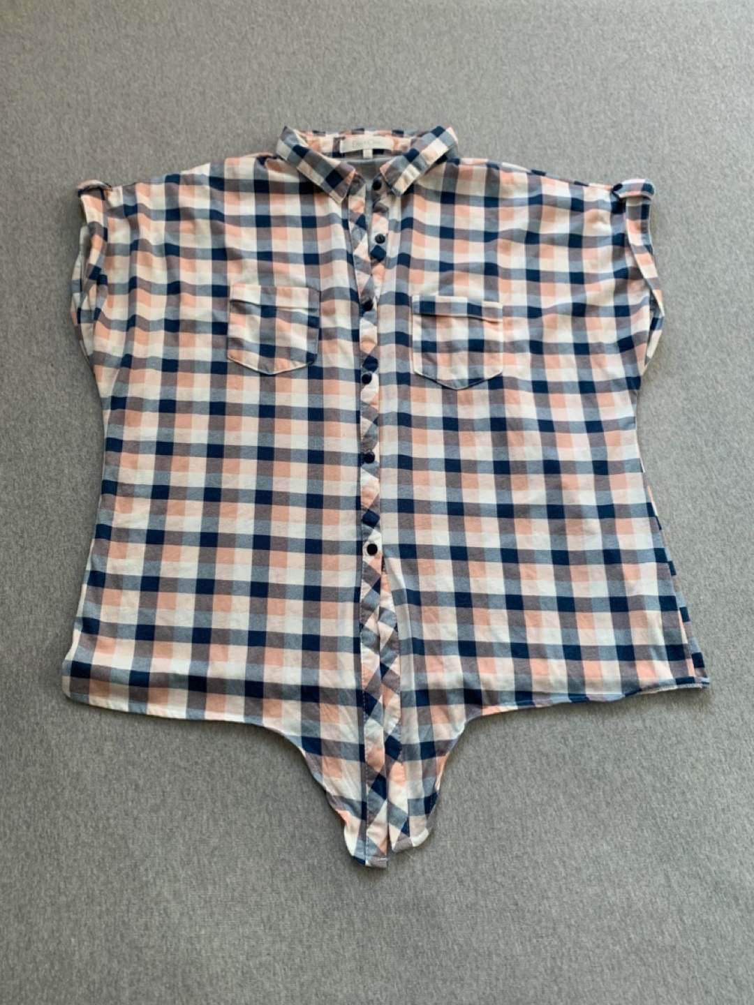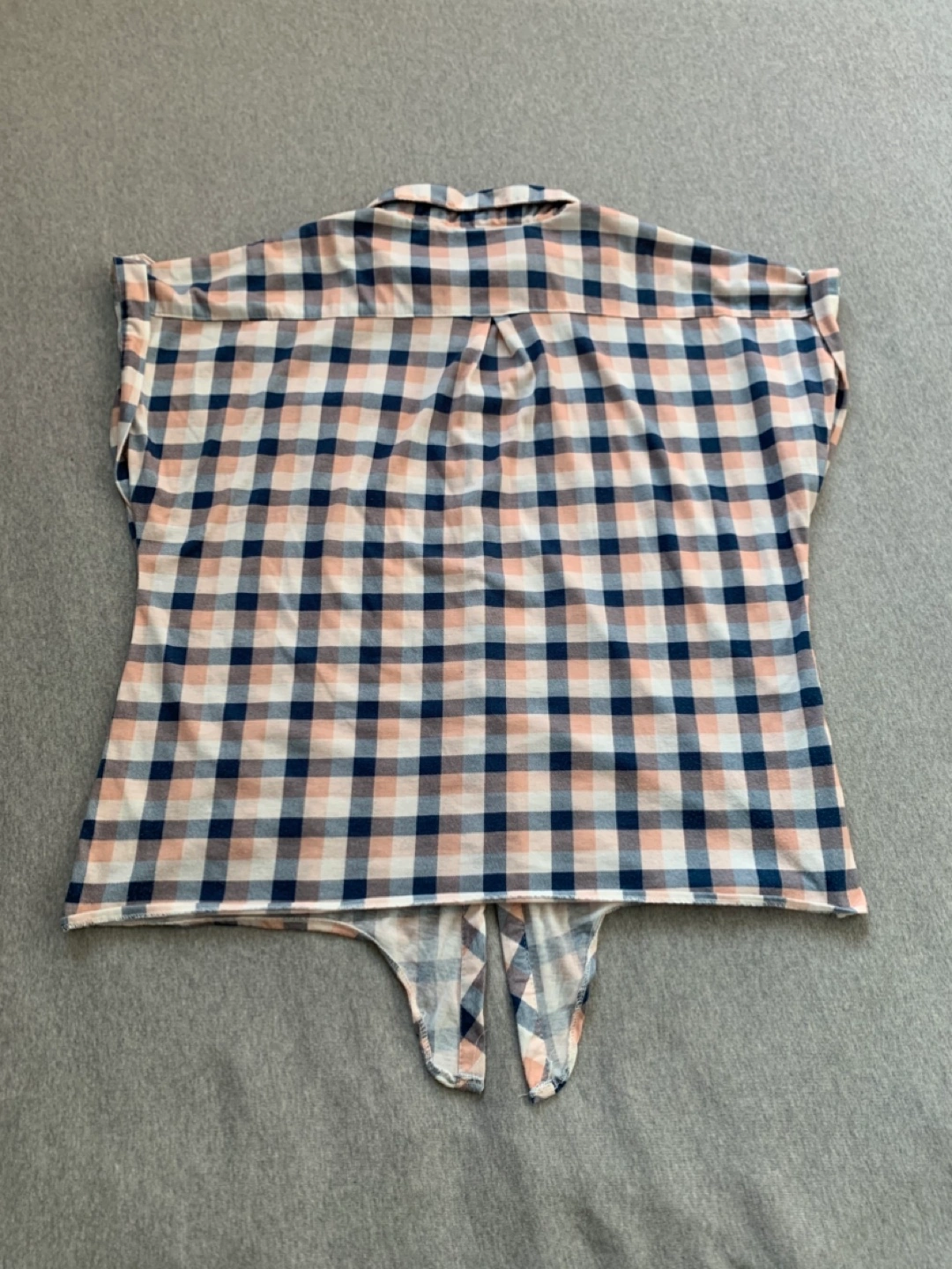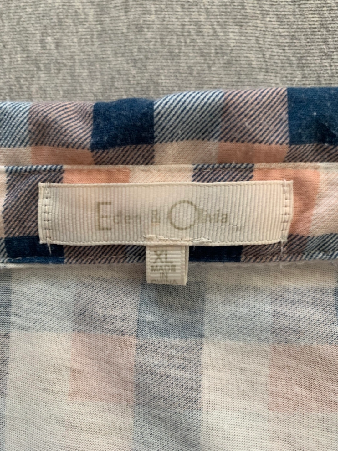 The top features a plaid pattern with lights pinks and navy blue. Has short sleeves with a tailored detail. Eden & Olivia brand.