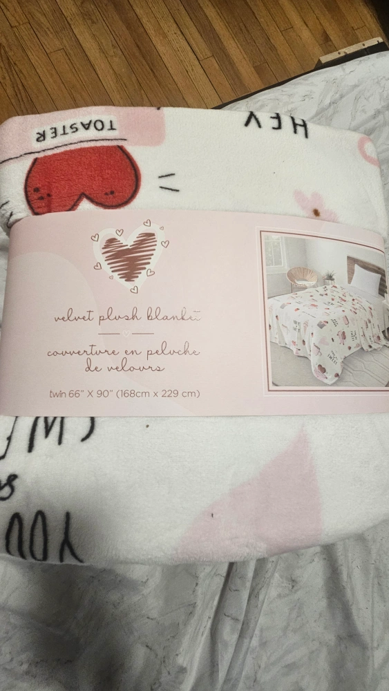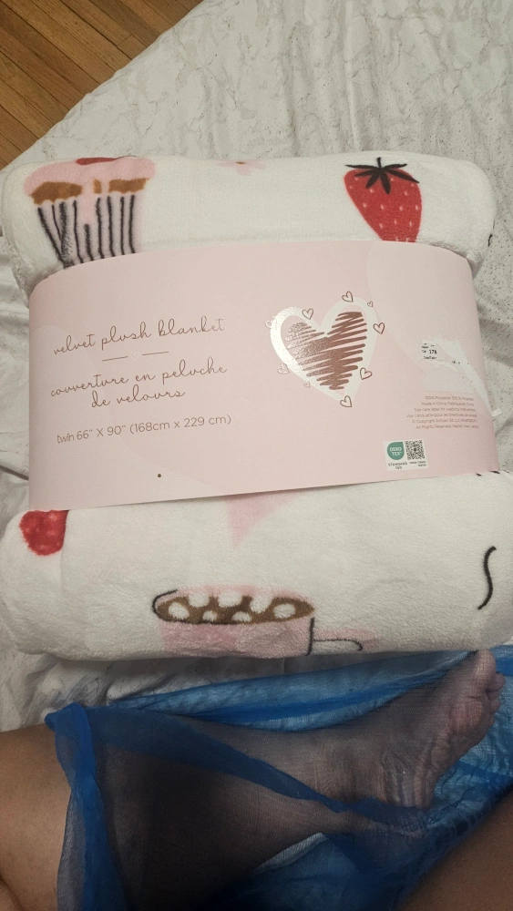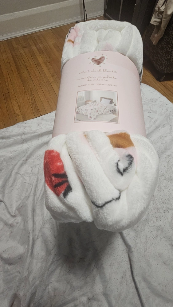 This blanket is ready for you to snuggle up and relax. It comes rolled up and tied together. It is a soft, plush material. The packaging displays the text "velvet plush blanket" and measurements of 66" x 90".