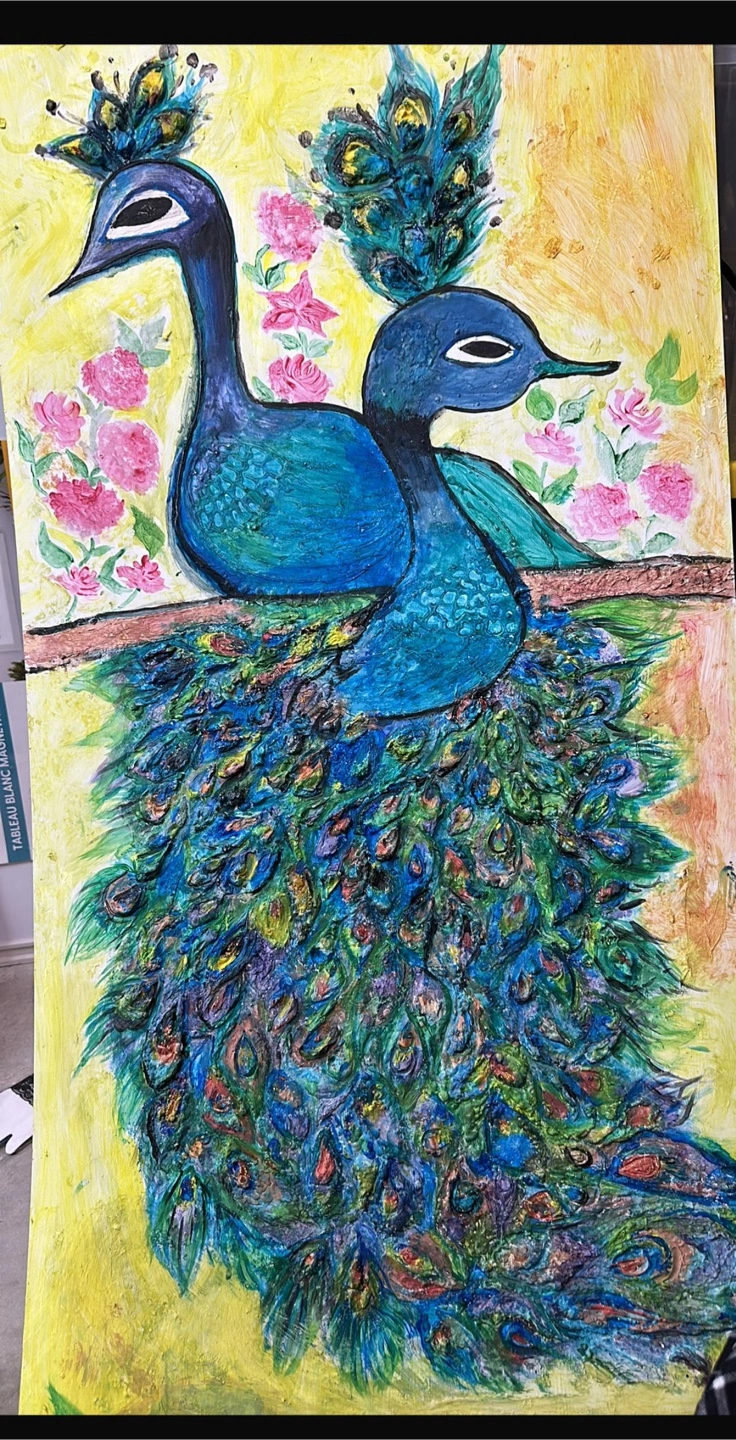 Painted artwork on canvas. Two peacocks perched on a branch. Pink flowers in the background. Textured brush strokes in vibrant colours. Displaying the painting in your home would create a relaxing atmosphere.