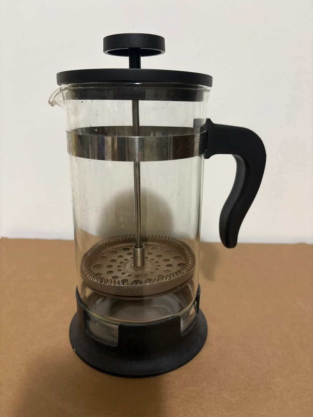 Glass cylinder with a black handle. Stainless steel filter. Features a black lid. You could enjoy a cup of coffee by simply brewing with this French press.