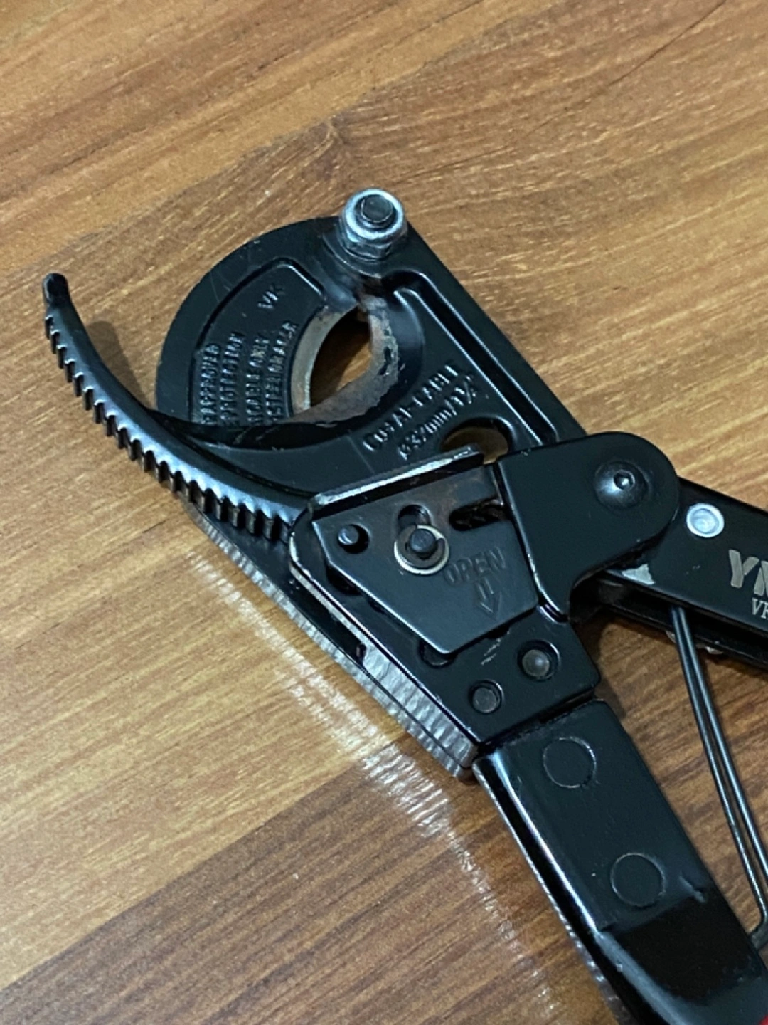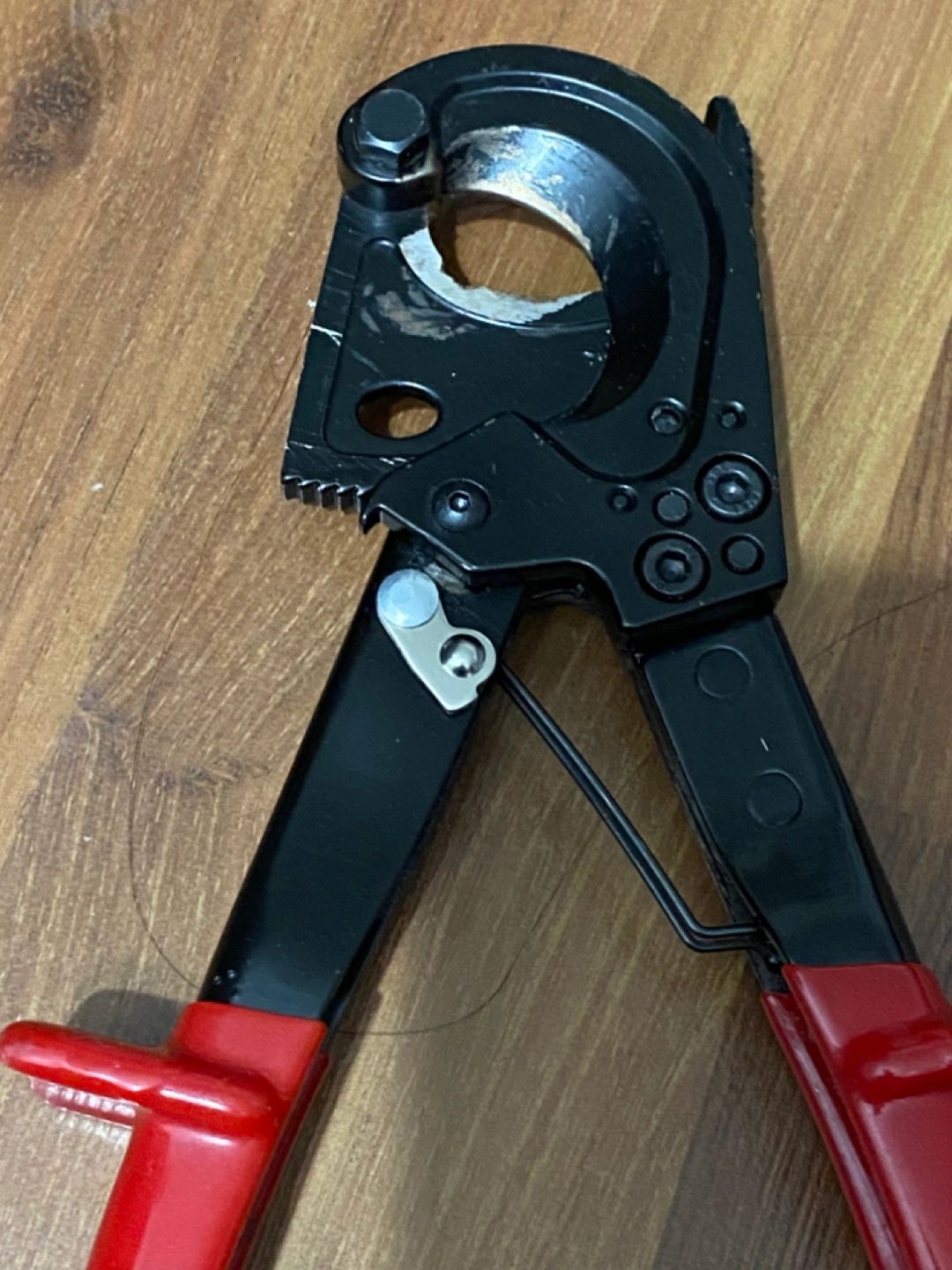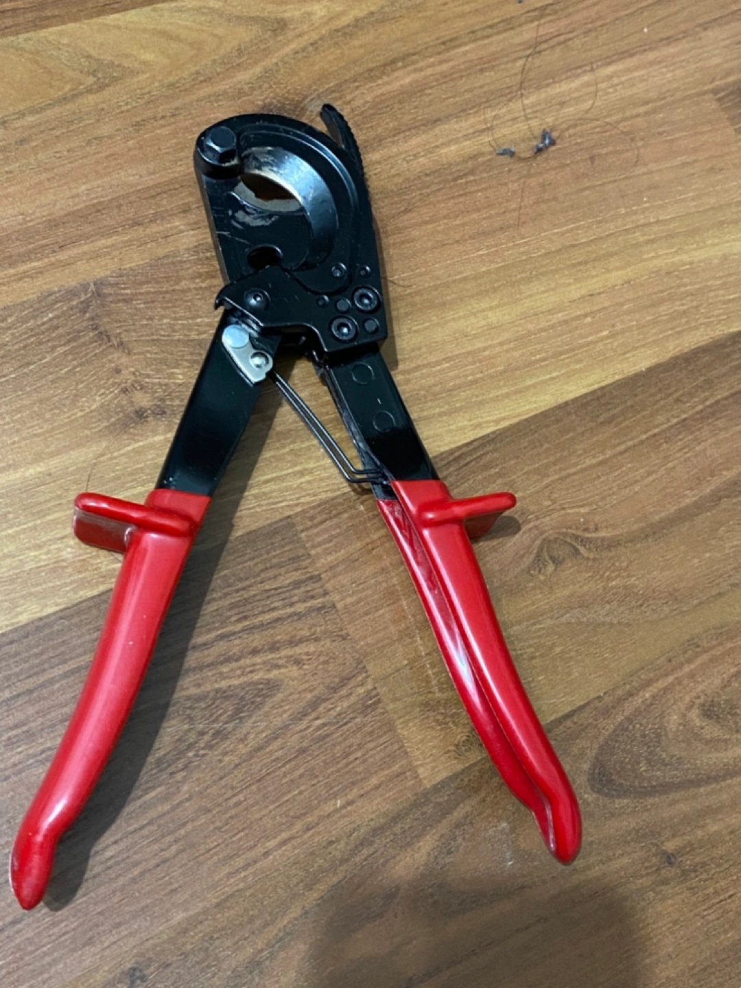 A wire cutting tool with red handles. The cutting part of the tool is black. The tool is compact in design, and would be perfect for any electrical work you may have.