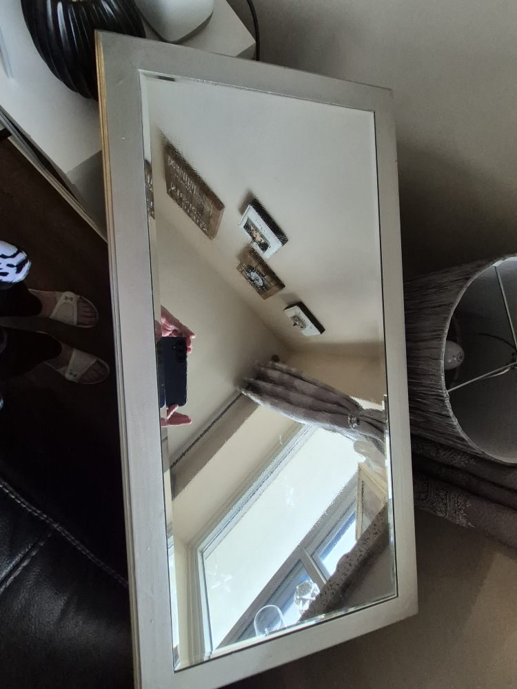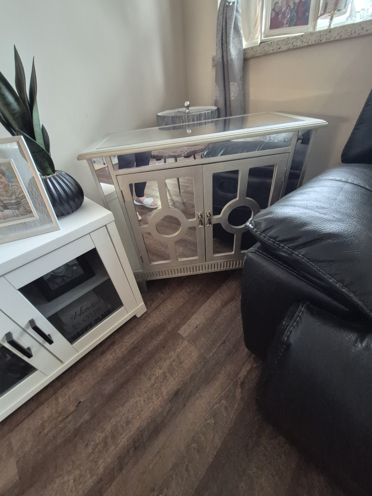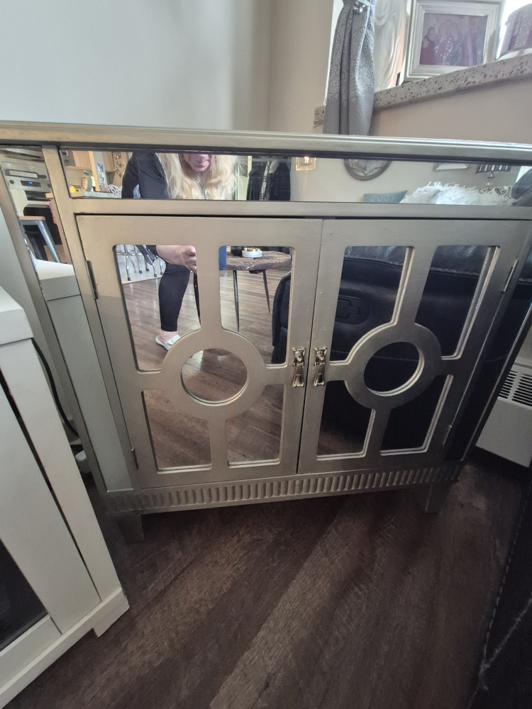 Silver-toned cabinet. Mirrored doors with geometric design. Mirror on top. Great for adding a little sparkle to a room.