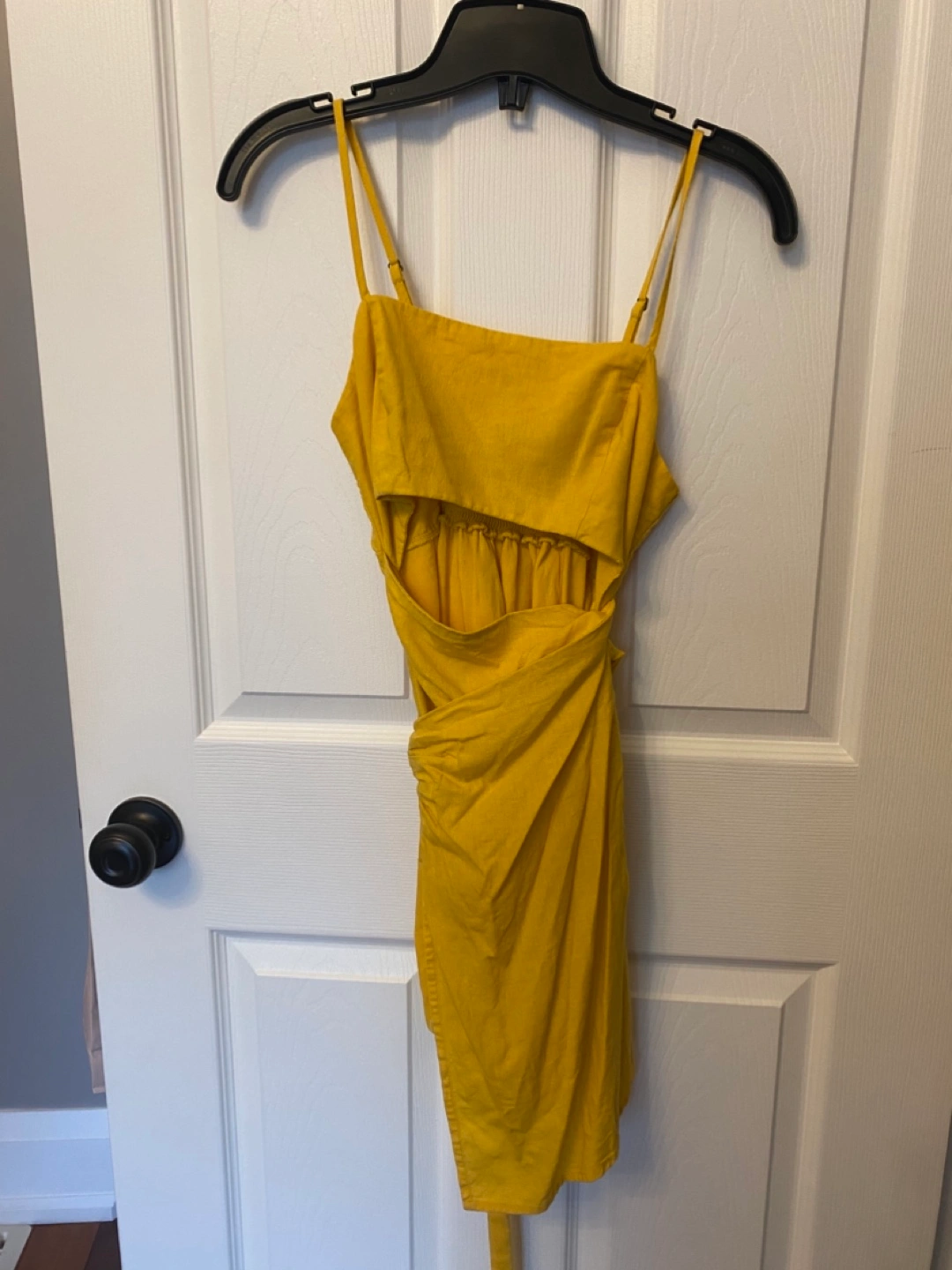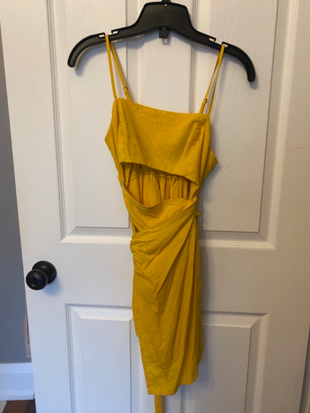 Yellow dress. Features spaghetti straps and a cut-out design. Fitted with a gathered skirt. Perfect for a warm, sunny day.