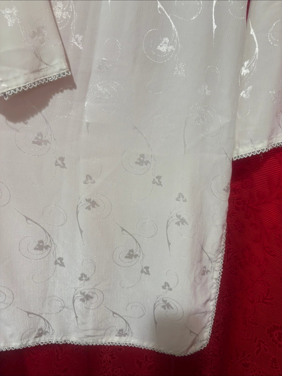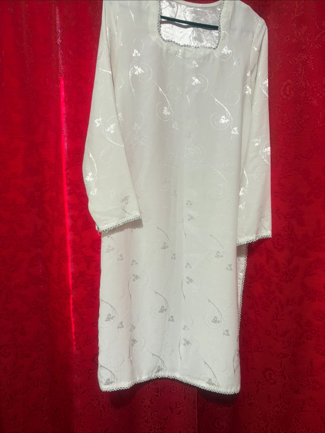 Beautiful two piece outfit. Features intricate floral patterns all over. Delicate silver details around the edges. Very soft and comfortable. This could be a perfect outfit for a relaxing evening at home.cash only ( size m-l )