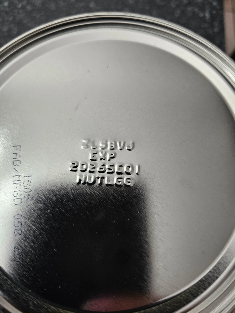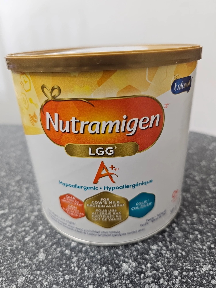 A tin of Nutramigen formula. A plastic lid rests nearby. This formula is known for its gentle properties, making it a soothing choice for your little one.