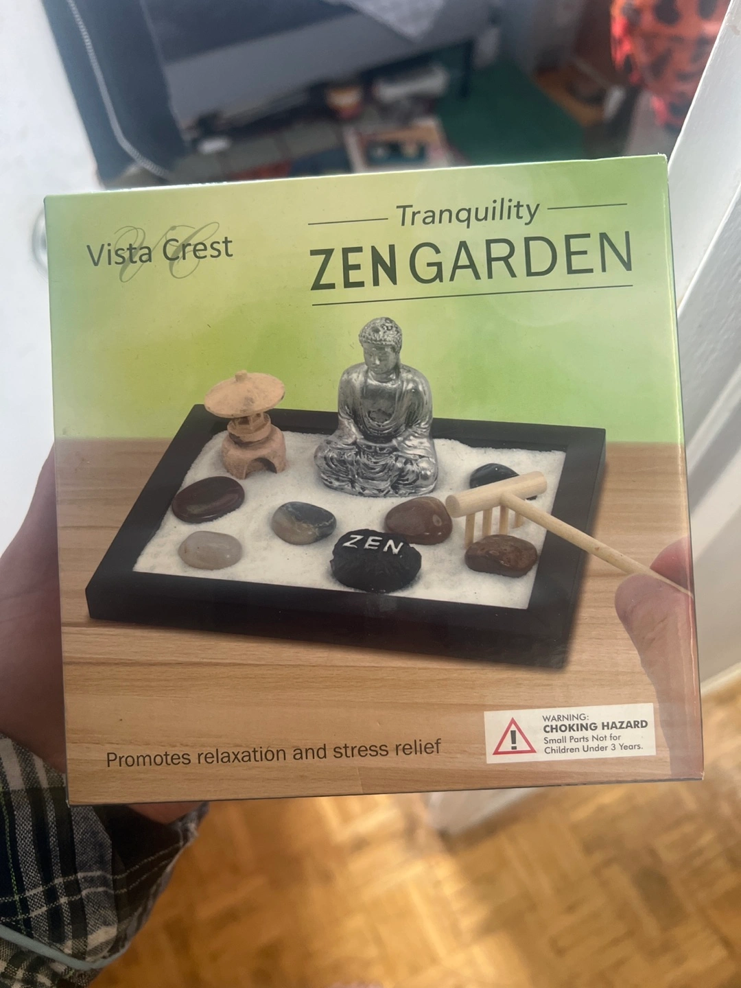 144A Zen Garden in a box. Contains a small Buddha statue. Complete with decorative rocks and a rake. A lovely little item to aid in finding peace and calm.