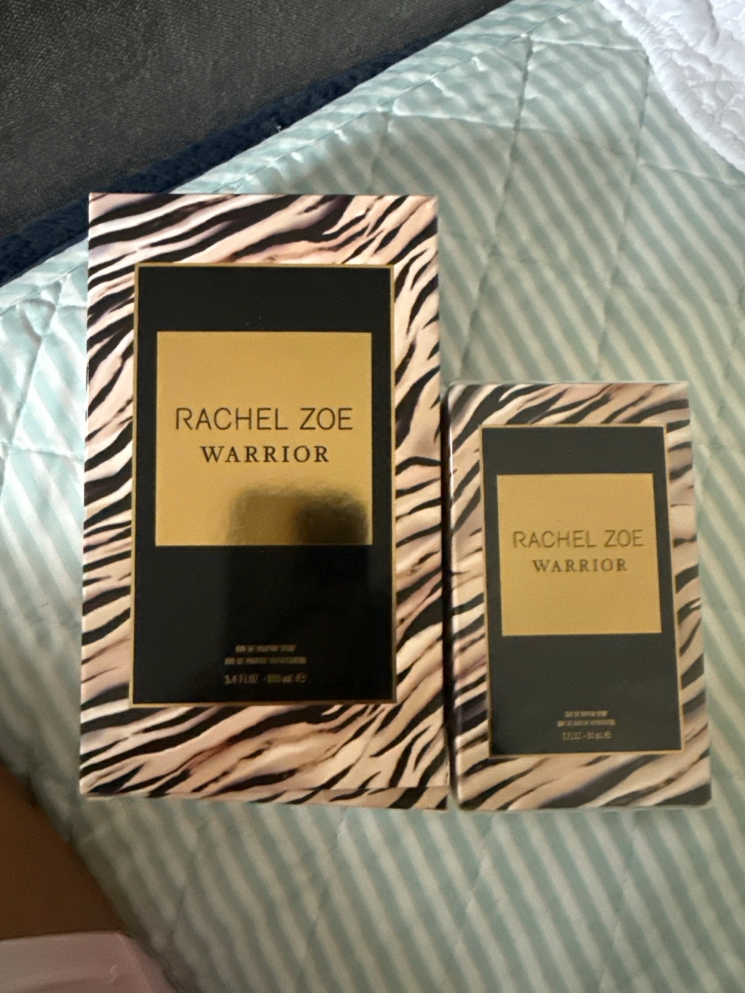 Two perfume boxes. One box is larger than the other. Both of them have a zebra pattern. They appear unused, ready to bring joy to the lucky buyer.