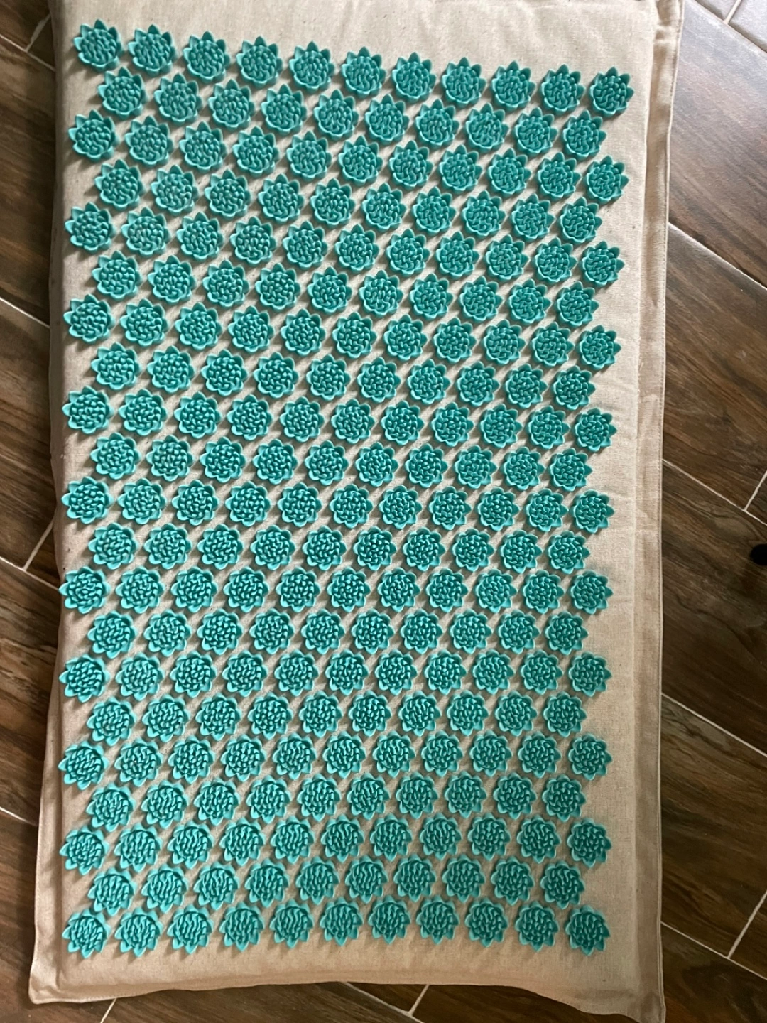 Acupressure mat with many small plastic points. Canvas-like backing. The mat can be used to soothe and relax.