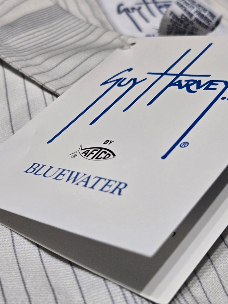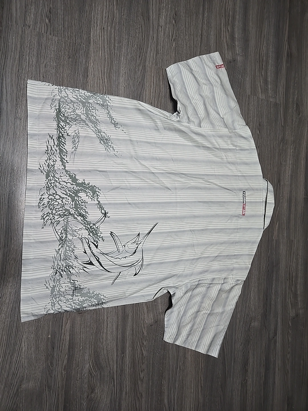 The shirt features a button-up closure. Stripes cover the shirt with a fish graphic on the front and back. A great shirt to wear on a hot day and dream of the sea.