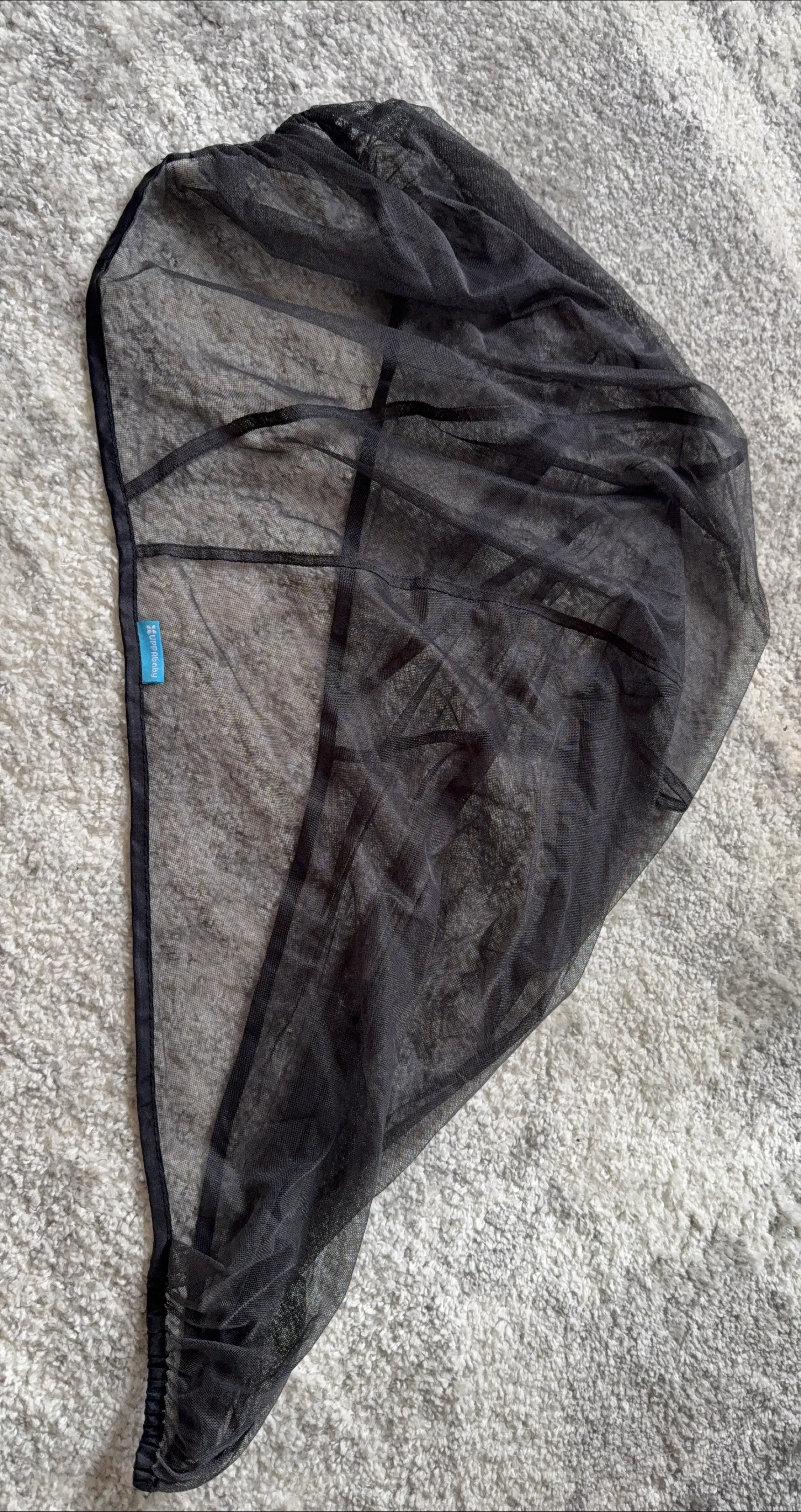 A bug shield, perfect for your stroller bassinet. Made of mesh, it provides a protective barrier. The shield appears to be in good condition. It is great for getting fresh air for your little one without any of the bugs.