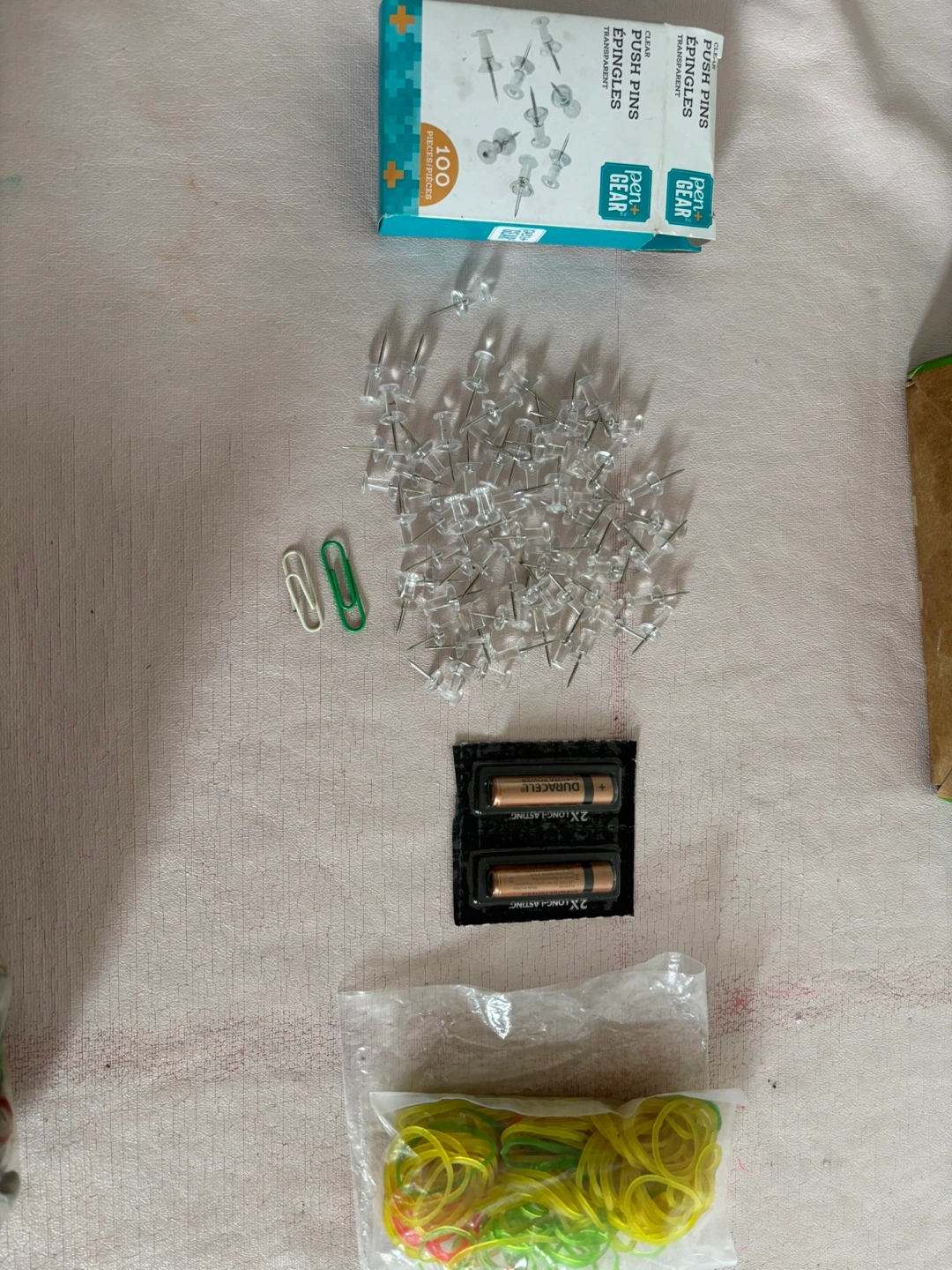 I am selling a bunch of office supplies, a true life saver for any office. Includes push pins, paper clips, rubber bands and batteries.