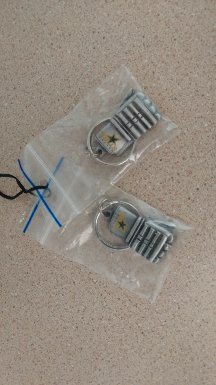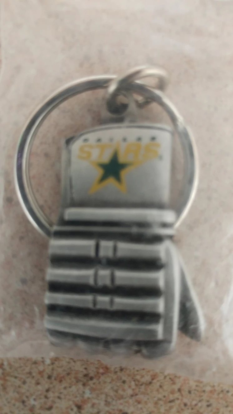 A set of two keychains. Each keychain features the Dallas Stars logo. The keychains are on a silver ring, making them easy to attach to your keys. This would be a great accessory for any fan, allowing them to keep their keys organized. (1" x 1.5")