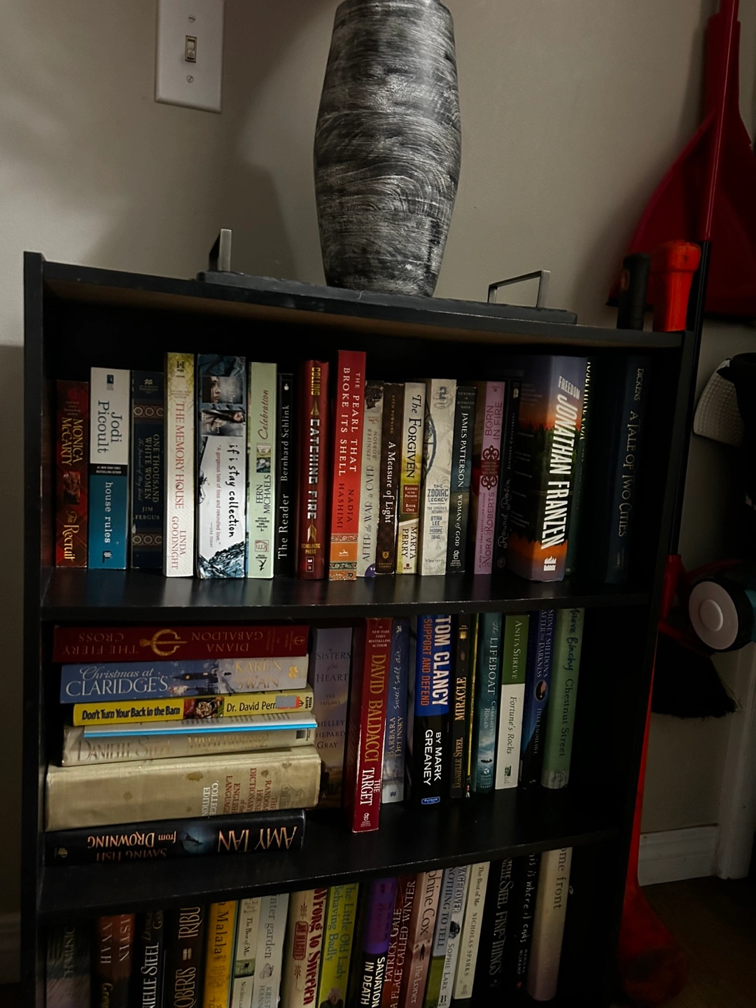 The bookshelf is dark, with books of different sizes and colours. A vase sits on the top shelf. A great spot to display your favourite reads to make your home feel cozy and inviting. $10 each or $300 for lot