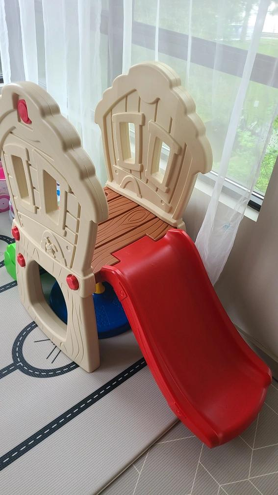 Playhouse, beige and red. Features a slide and openings. Offers a great play time experience for your little ones.
