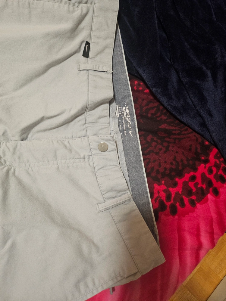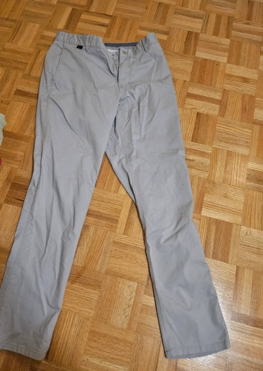 Light gray pants. With multiple pockets. Featuring a button and zipper closure. Perfect for a relaxing day outside.