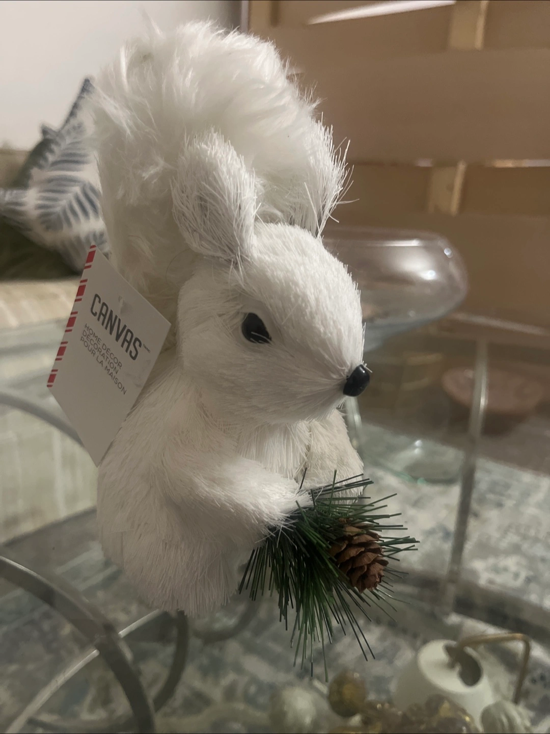 A white squirrel decoration, holding a small pine cone. It has a fluffy tail and soft fur. It's a lovely addition to your home decor to bring a touch of nature into your space.