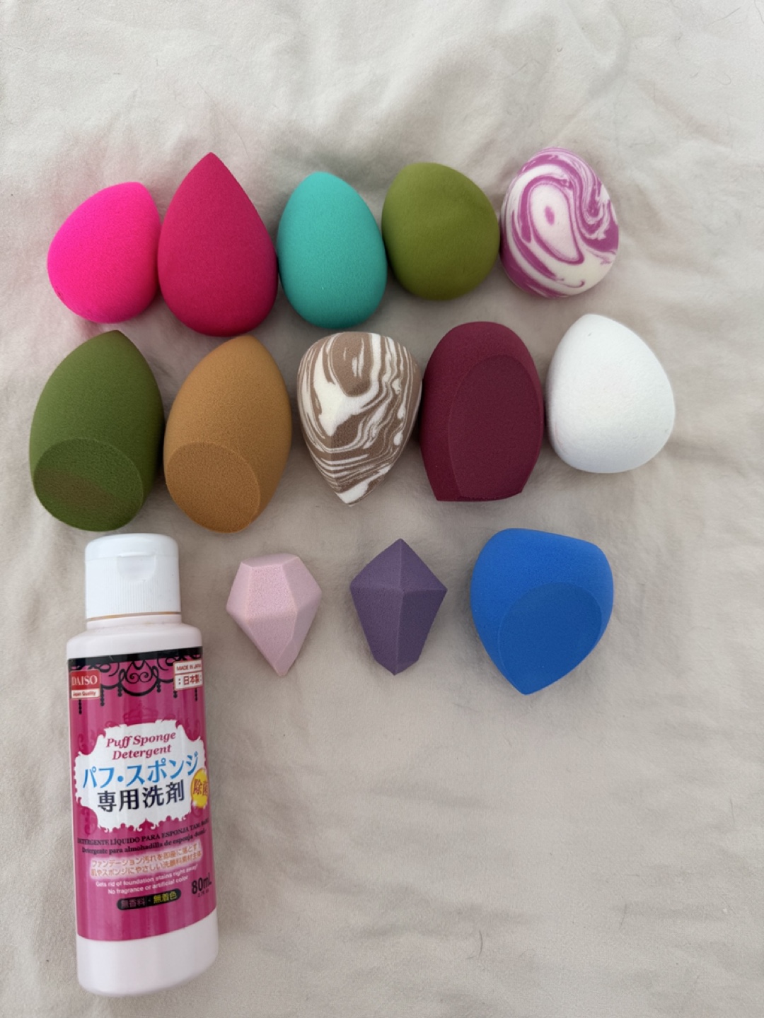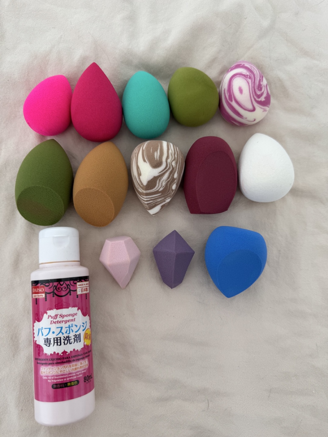 Make-up sponges in many shapes and colours. Includes a bottle of puff sponge detergent. You can use these sponges for a professional makeup application, it will be very relaxing.
