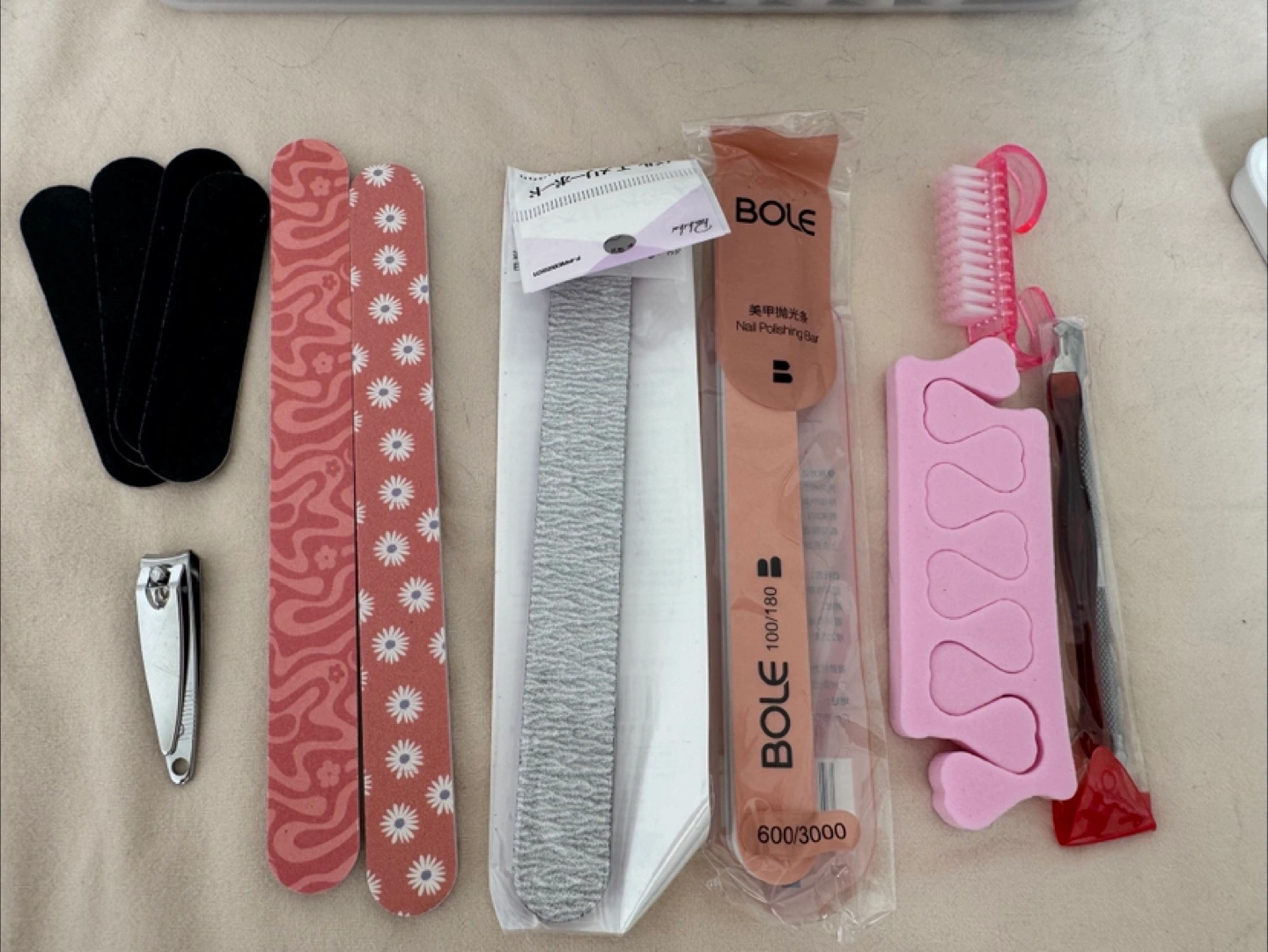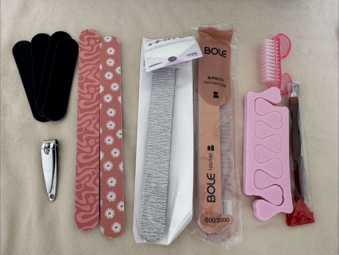 A complete kit for your nail care needs. Comes with various nail files, a nail clipper, toe separators, and a brush. This kit will help you achieve a relaxing and spa-like experience at home.