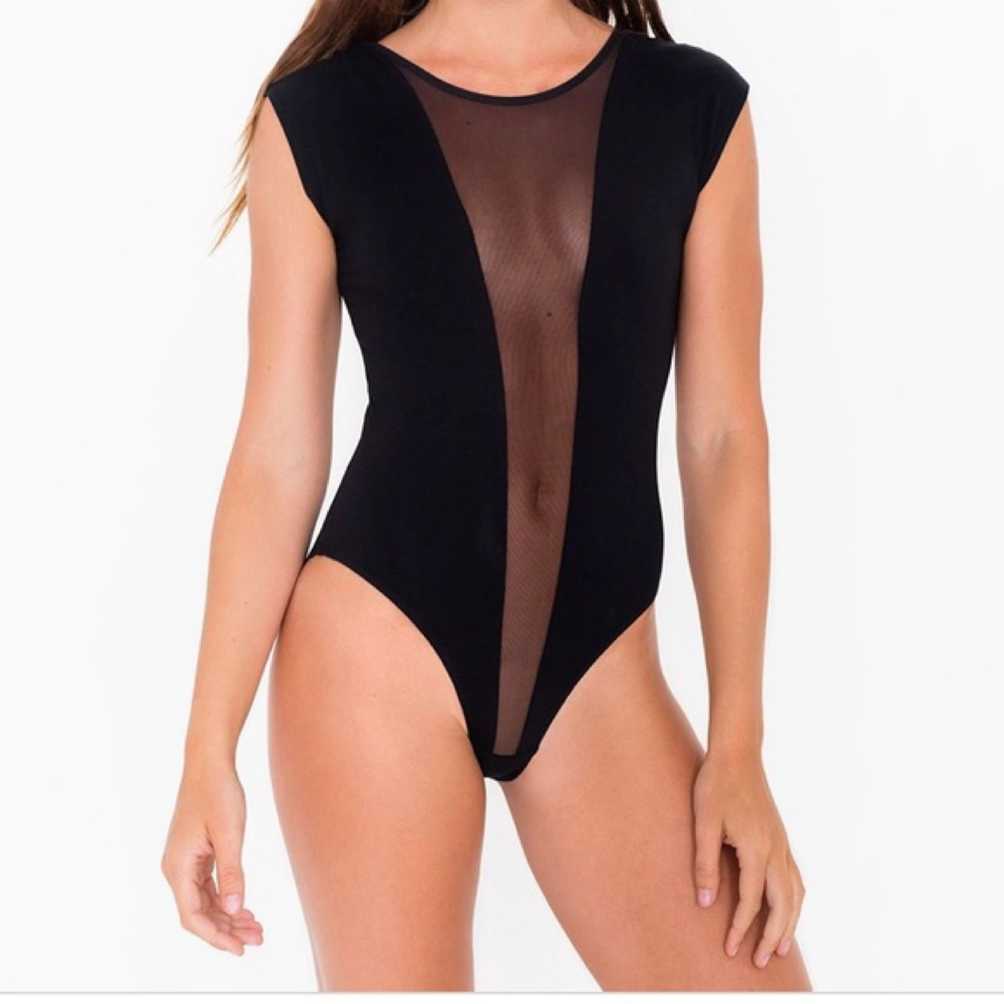American Apparel Black bodysuit that features sheer mesh V-neck detail. Excellent for layering or wearing alone.
