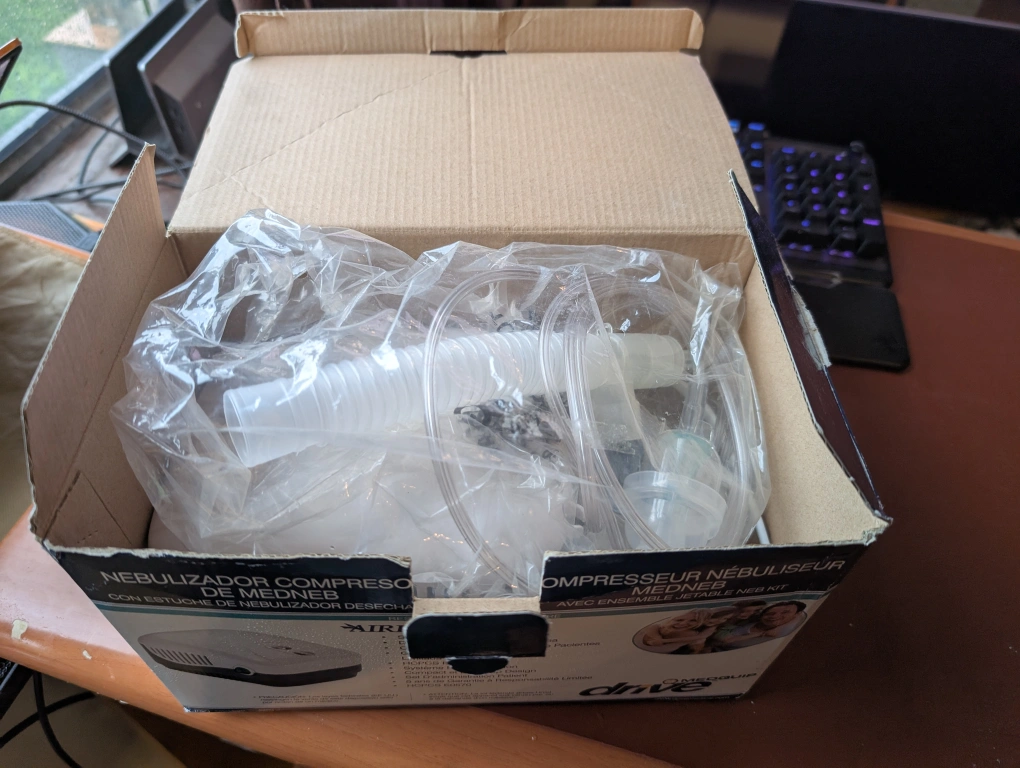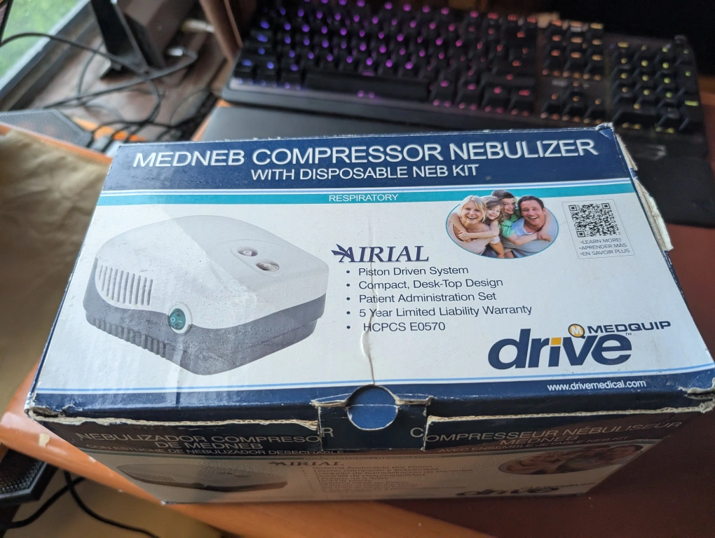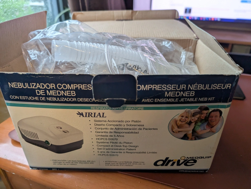 Selling a MEDNEB compressor nebulizer, comes with a disposable neb kit. The box is shown with all its contents still inside. This nebulizer can be a great addition for easy breathing.