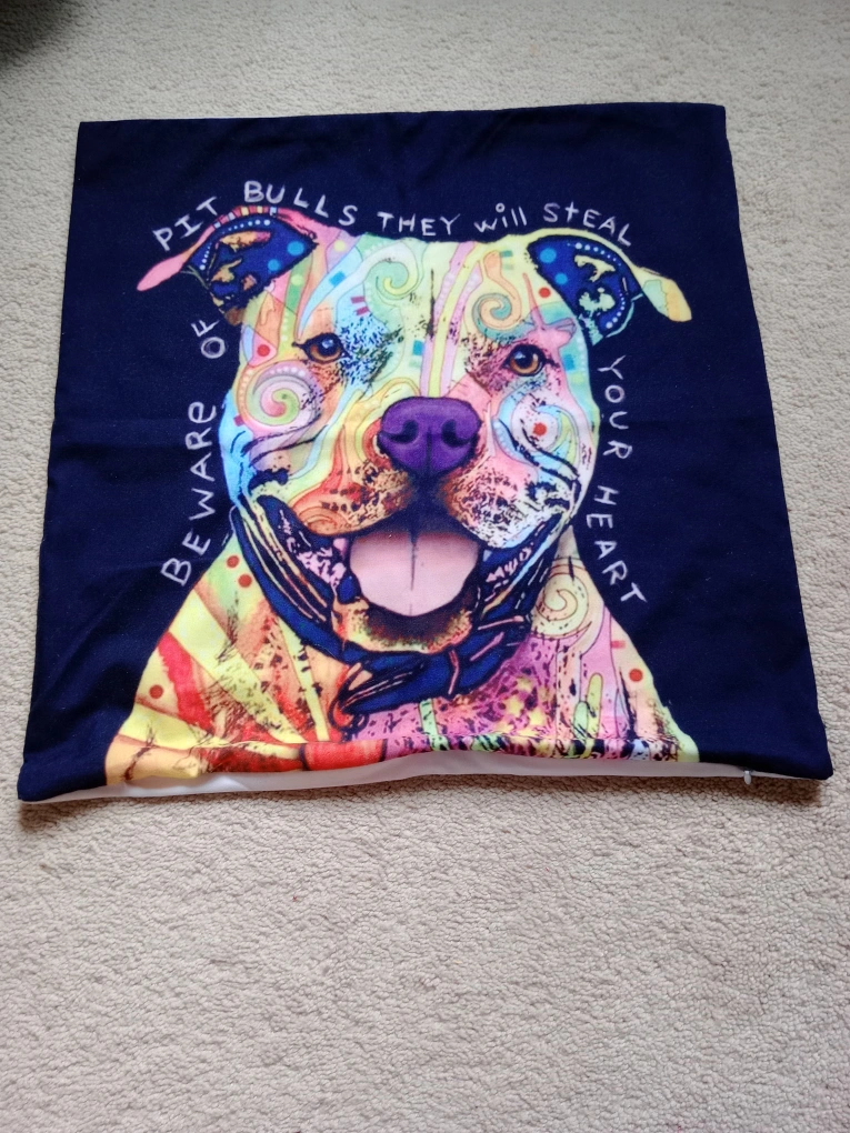 Add a pop of colour and canine charm to your space with this decorative throw pillow featuring a vibrant pitbull design. This pillow is in good condition, ready to brighten up any room with its unique graphic. It's perfect for dog lovers or anyone looking to add a playful touch to their decor. This cushion is just waiting to add some pep to your favourite seat.