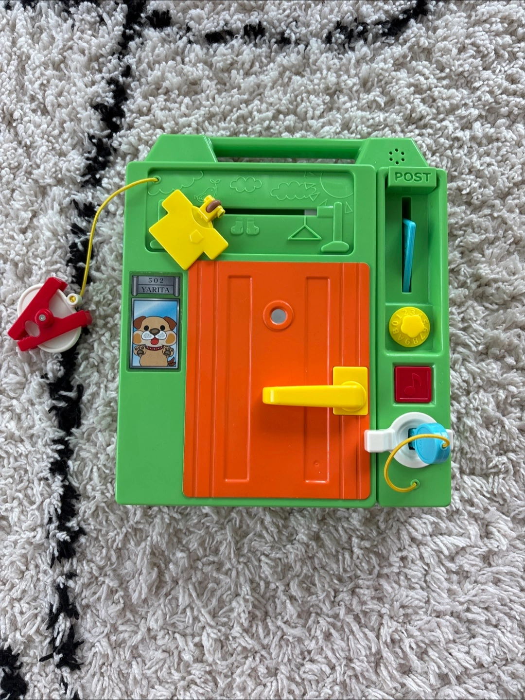 A bright green activity centre toy. Features multiple different elements. Includes accessories, door, and a post slot. An interactive toy that's perfect for sparking a child's imagination.