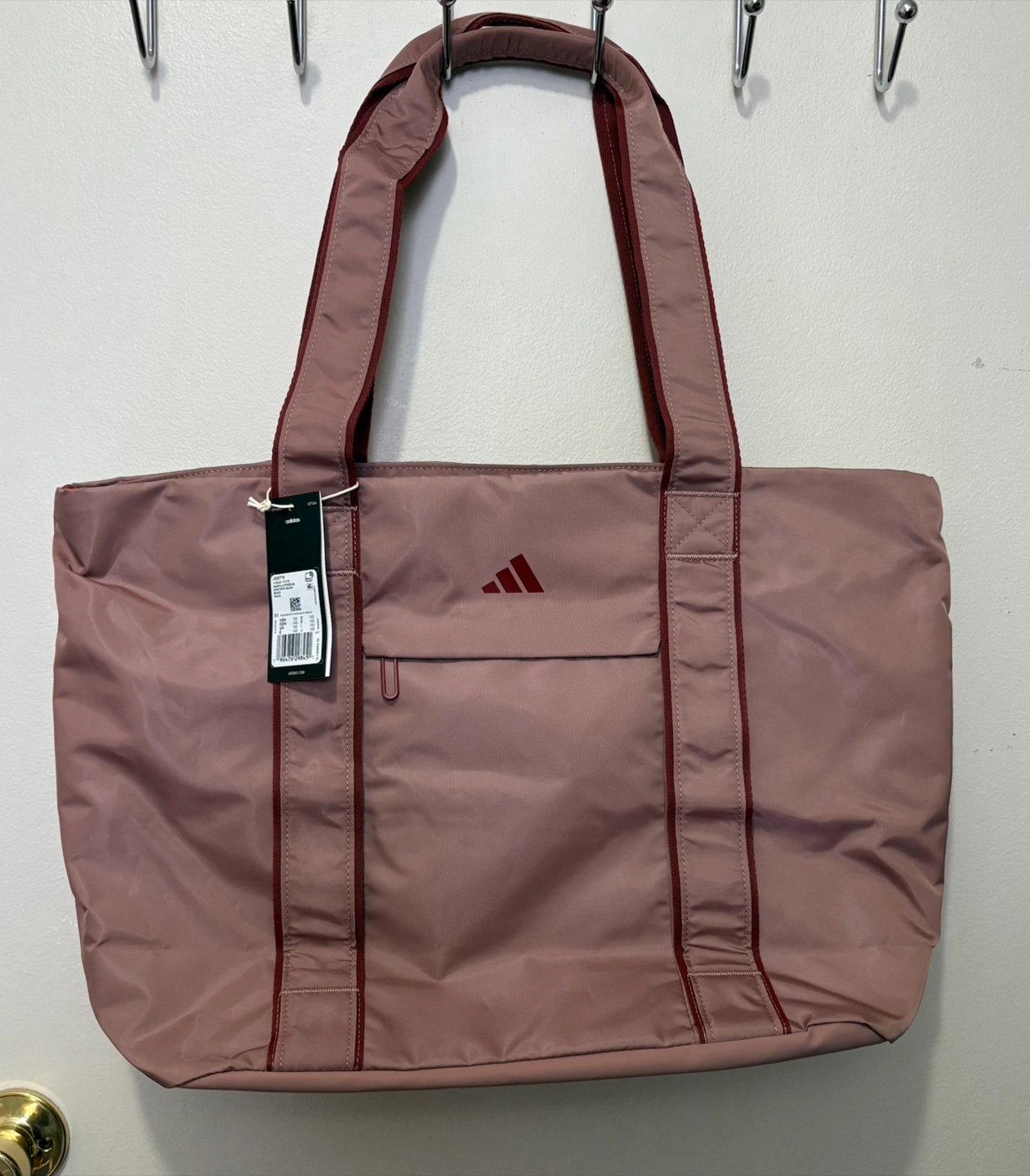 677New Adidas Tote bag . New with Tags Shoulder straps in a contrasting colour. Product Color-Warm Clay/Preloved Ruby A small pocket on the front. Perfect to take with you to your next yoga class. It is also great for carrying your essentials and some extra items after a long day. Authentic 😊 SPECIFICATIONS • Dimensions: 7.9" x 22" x 14.2" • Volume: 25 L • 100% polyester (recycled) • Divided slip-in pockets • Front zip pocket • Padded divider • Cording system to attach yoga mat • Imported • Product colour: Warm Clay / Preloved Ruby ➡️The price is firm. Original Price- $70 plus tax- $79.10