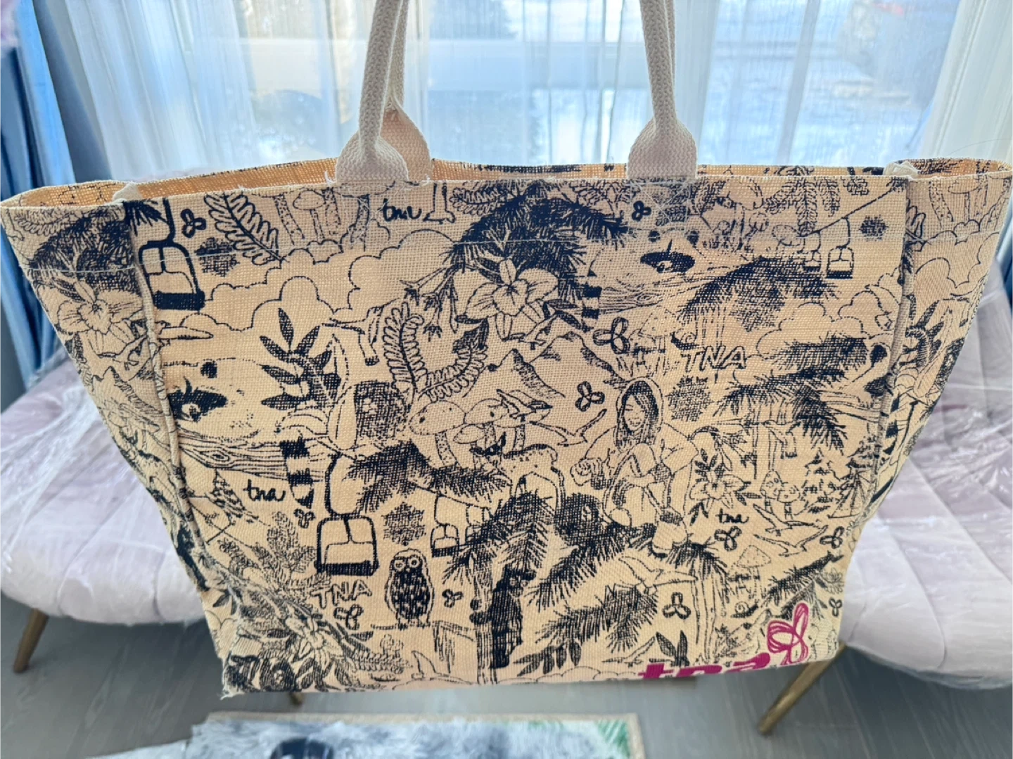 Selling a big TNA tote bag! It's in great condition and perfect for carrying all your essentials. It has a unique design.