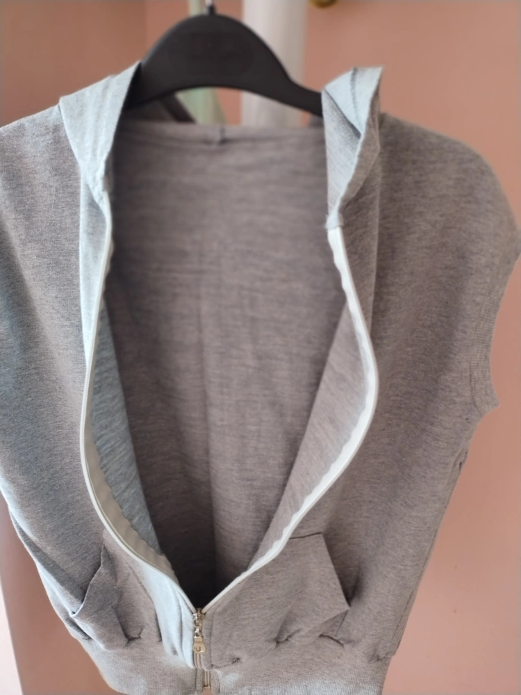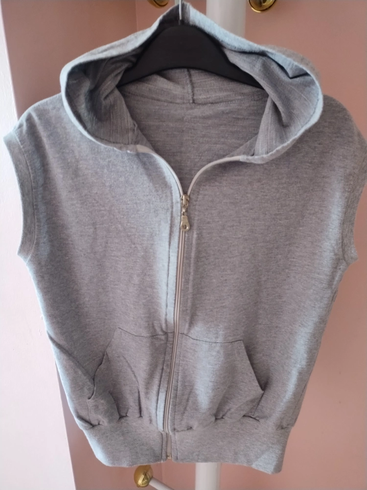 This grey sleeveless hoodie is ready to wear. The hoodie comes with a zipper in the front, a hood, and a front pocket. Made of soft cotton fabric. Couple times worn and washed. Size S - MEd.