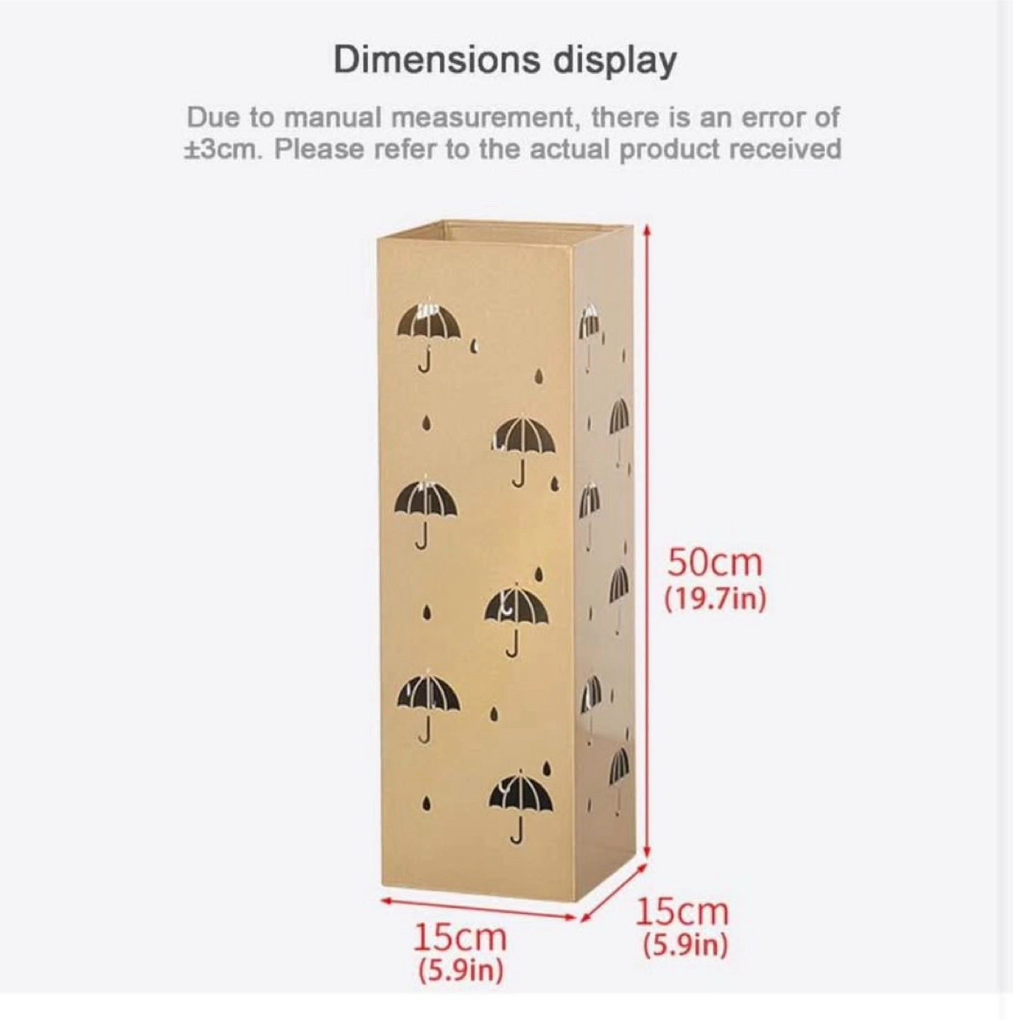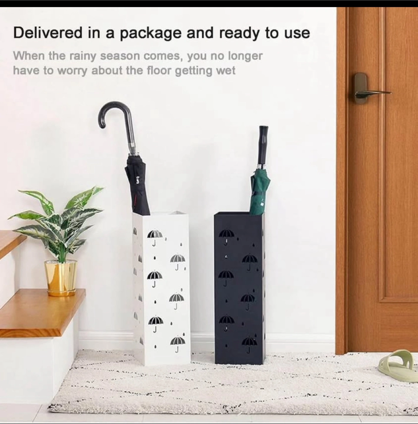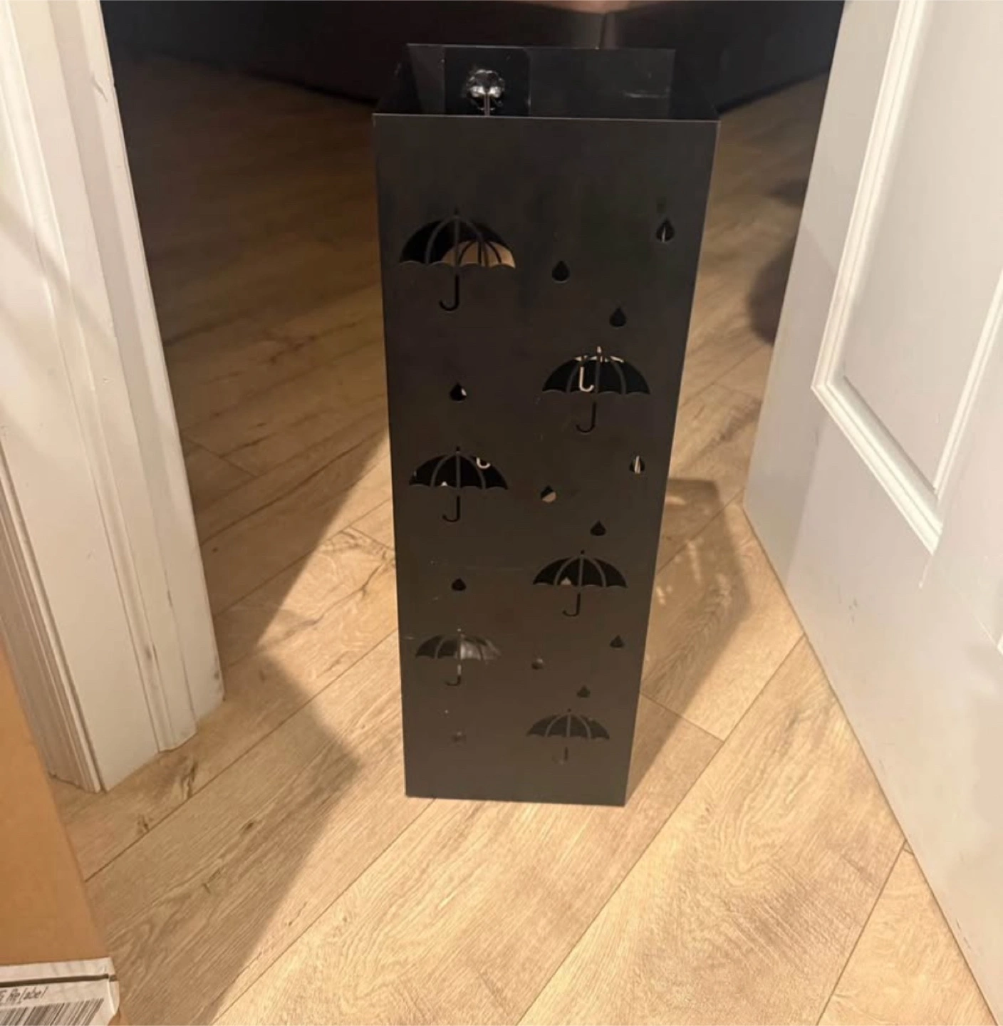 Rectangular black umbrella holder. Decorated with umbrella cutouts. Perfect for keeping your umbrellas organized and your entryway tidy, providing a sense of serenity.