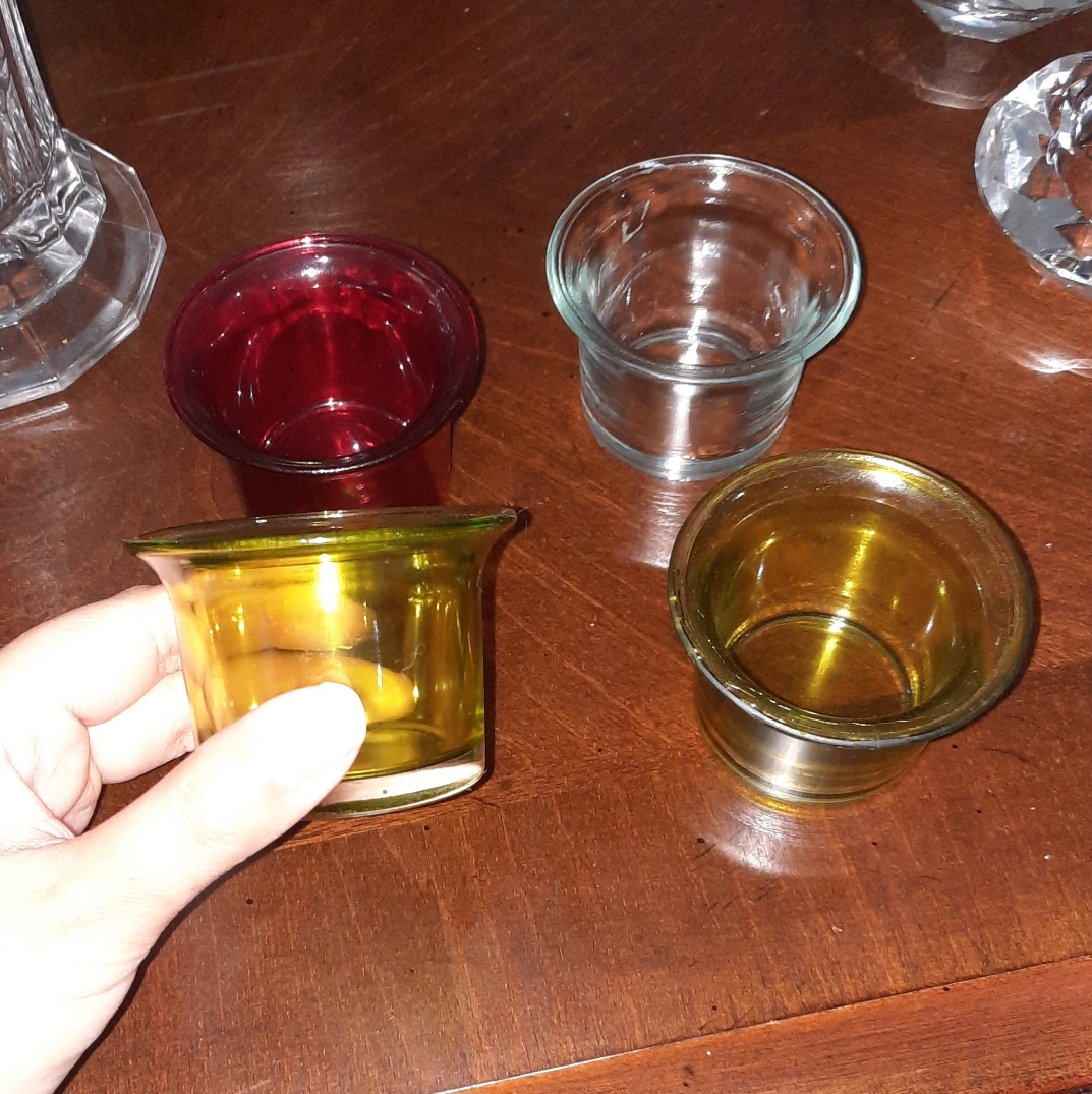 29A set of four glass candle holders in different colours. Features a red, clear, and two yellow-gold tinted candle holders. They are of the same shape and size, perfect for setting a relaxing ambiance.