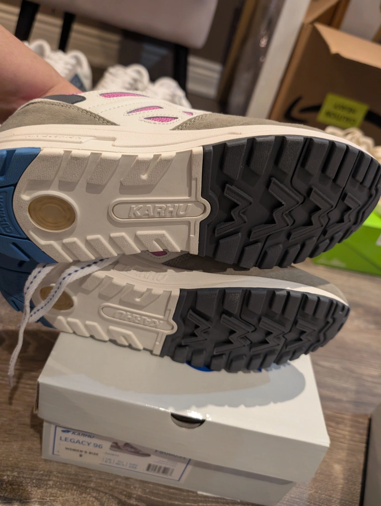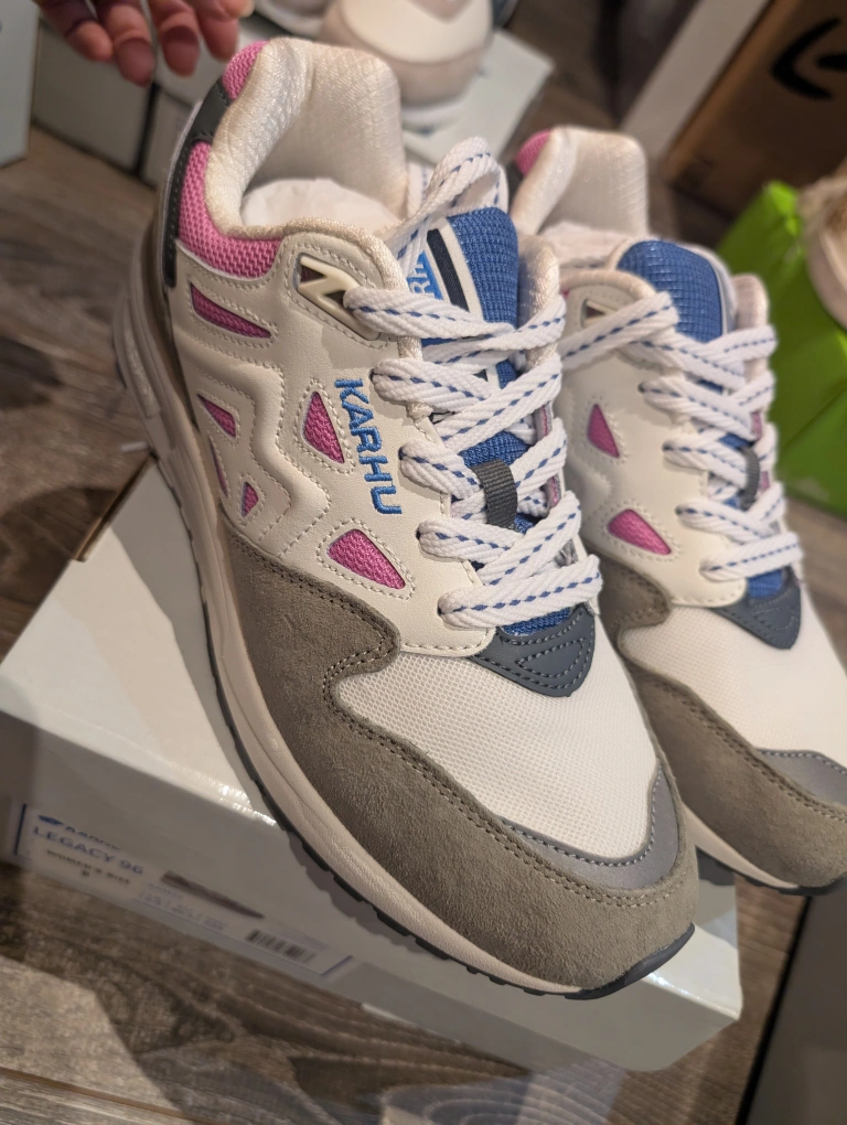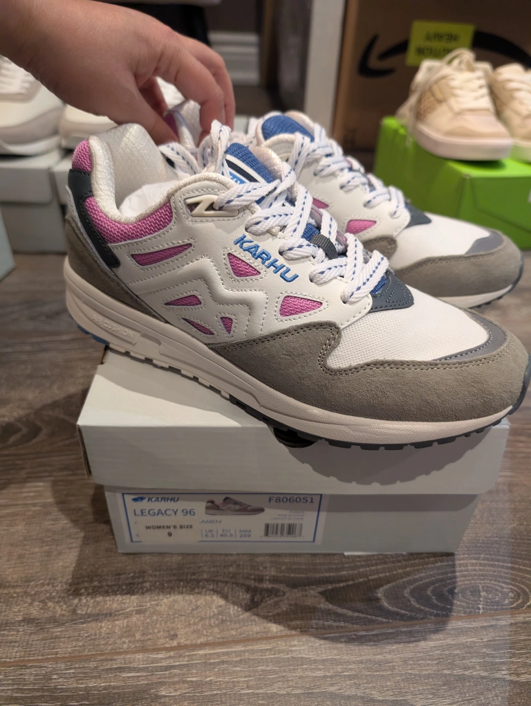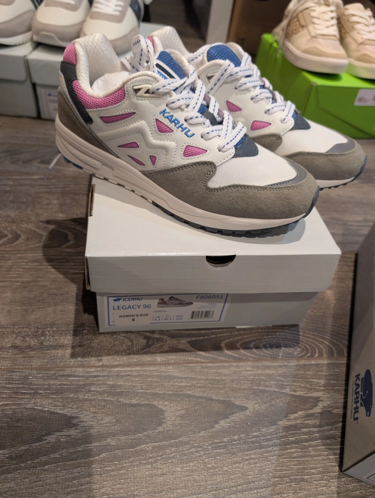 Brand new never worn, in original box. Karhu Legacy 96 sneakers in size 9. The sneakers have a white, pink, and grey colour scheme.